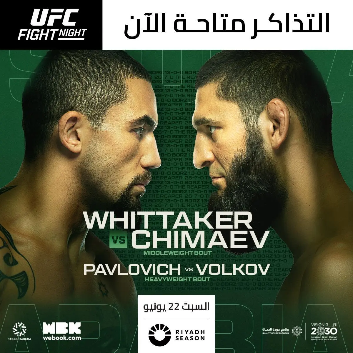 تحتضن الرياض في 22 من يونيو المقبل أول حدث لـ UFC -أبرز منظمة لفنون القتال المختلطة في العالم-، ويأتي النزال الرئيس بين الأسترالي روبرت ويتكر، والإماراتي حمزة شيماييف.
