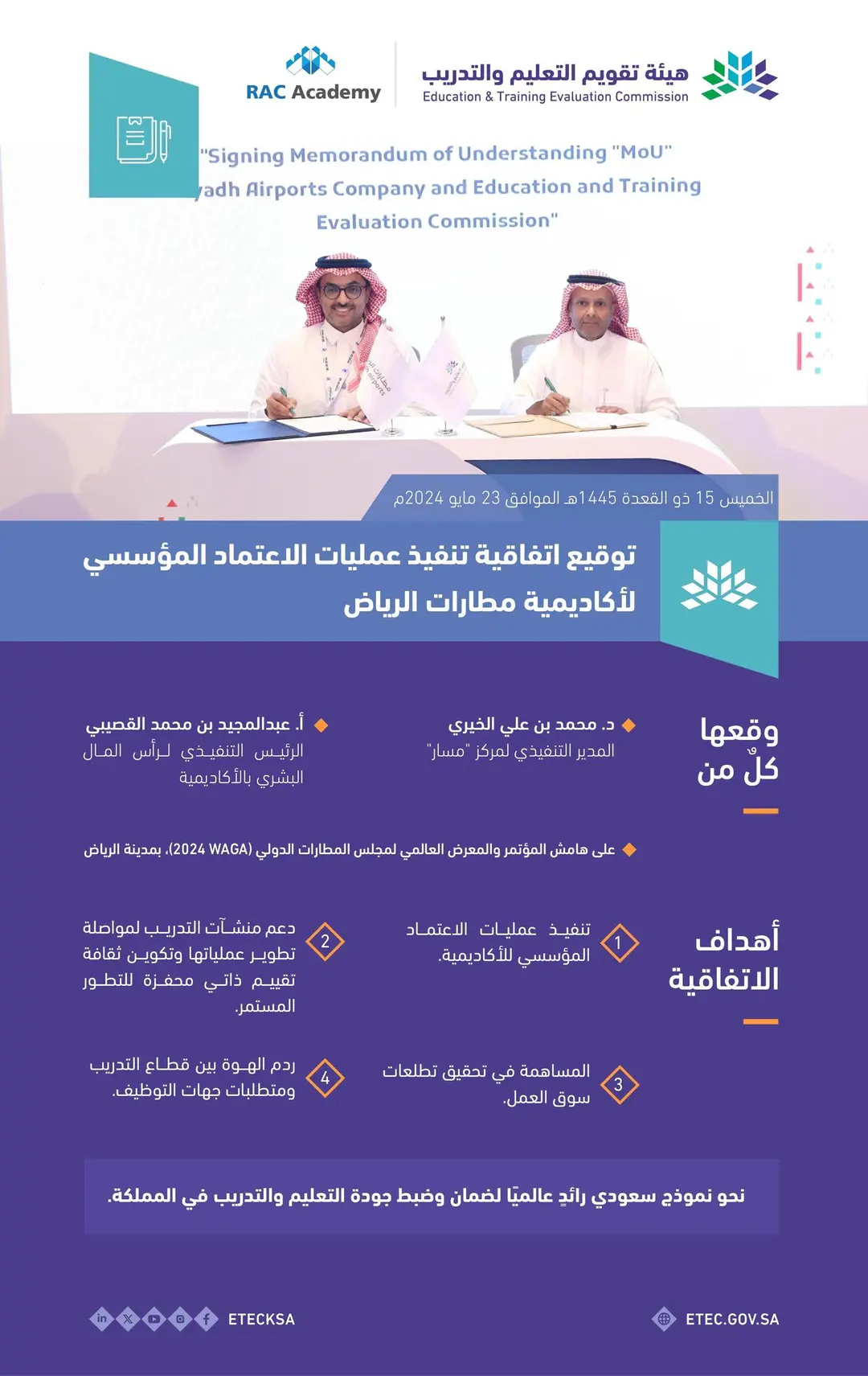 هيئة تقويم التعليم والتدريب توقع اتفاقية تنفيذ عمليات الاعتماد المؤسسي لأكاديمية مطارات الرياض