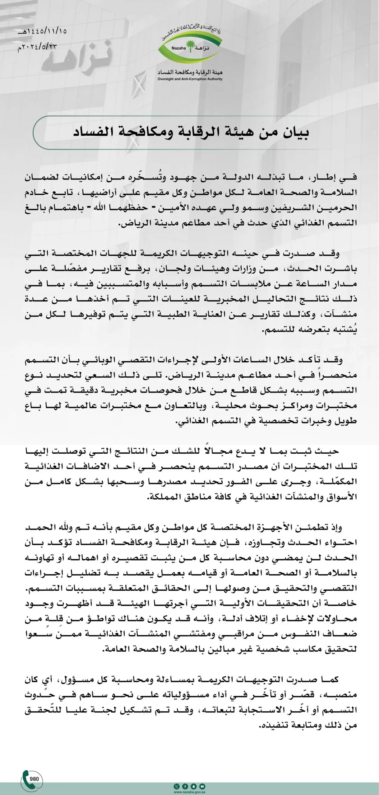 بيان من هيئة الرقابة ومكافحة الفساد حول حادث التسمم في أحد مطاعم الرياض.. وصدور التوجيهات الكريمة بمساءلة ومحاسبة كل مسؤول قصّر أو تأخّر في أداء مسؤولياته