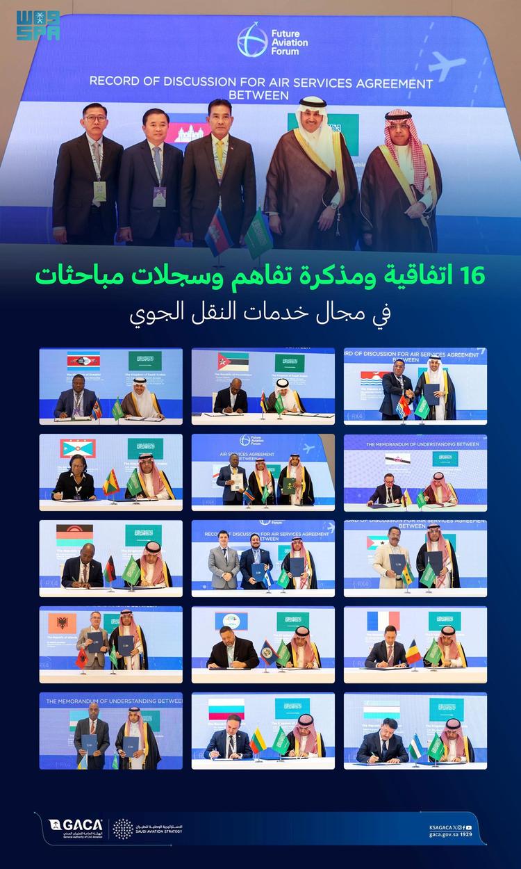 شهدت فعاليات مؤتمر مستقبل الطيران 2024، في نسخته الثالثة، الذي أقيم بتنظيم من الهيئة العامة للطيران المدني، خلال الفترة من 20 – 22 مايو الجاري تحت شعار “تعزيز مستوى الربط العالمي”، واختتم فعالياته أمس الأول في العاصمة الرياض توقيع ١٠٢ اتفاقية ومذكرة تفاهم وصفقة، منها ١٦ اتفاقية ومذكرات تفاهم وسجلات مباحثات للمملكة.