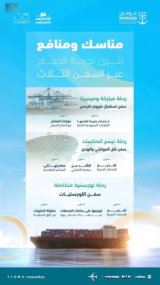 وأوضحت الهيئة أن إساهامات الموانئ في موسم الحج لا تقتصر على استقبال الحجاج بل تمتد إلى تقديم خدمات لوجستية إستراتيجية تتمثل في توفير السلع ولأدوية التي يتطلبها موسم الحج في الوقت والكميات المطلوبة، إضافة إلى استقبال السفن الناقلة للمواشي المخصصة للهدي والأضاحي وفسحها والتأكد من سلامتها وتسهيل نقلها من الميناء إلى المشاعر المقدسة عبر مبادرة طريق الهدى والأضاحي المقدمة من الموانئ بالتنسيق مع الجهات المختصة لتمكين الحجاج من الوفاء بنسك حجهم بكل يسر وسهولة.
