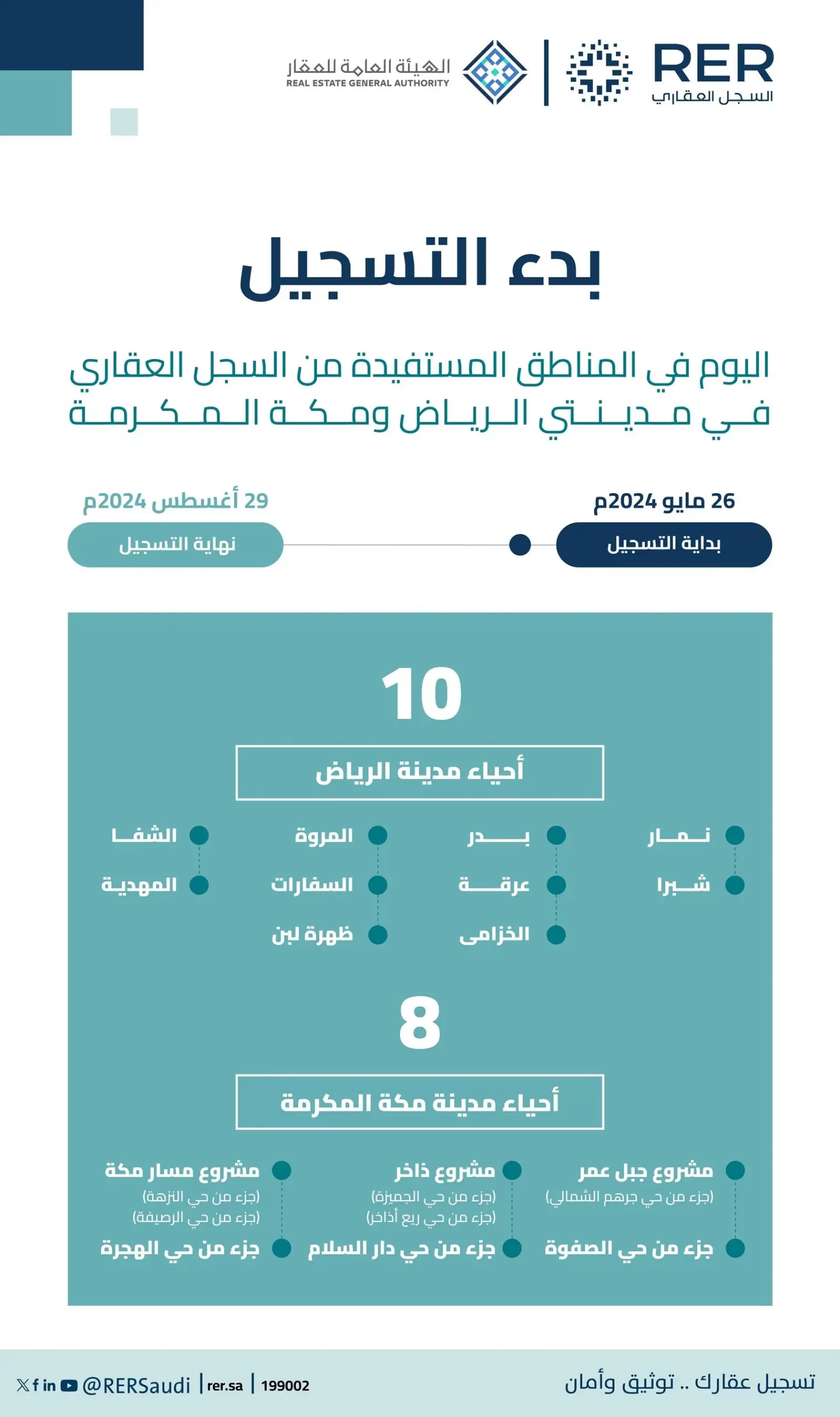 أعلنت الهيئة العامة للعقار بدء التسجيل في 7 مناطق عقارية، تشمل 18 حيًّا في مدينتي الرياض ومكة المكرمة، ويستمر التسجيل حتى نهاية يوم 25 صفر 1446هـ الموافق 29 أغسطس 2024م.