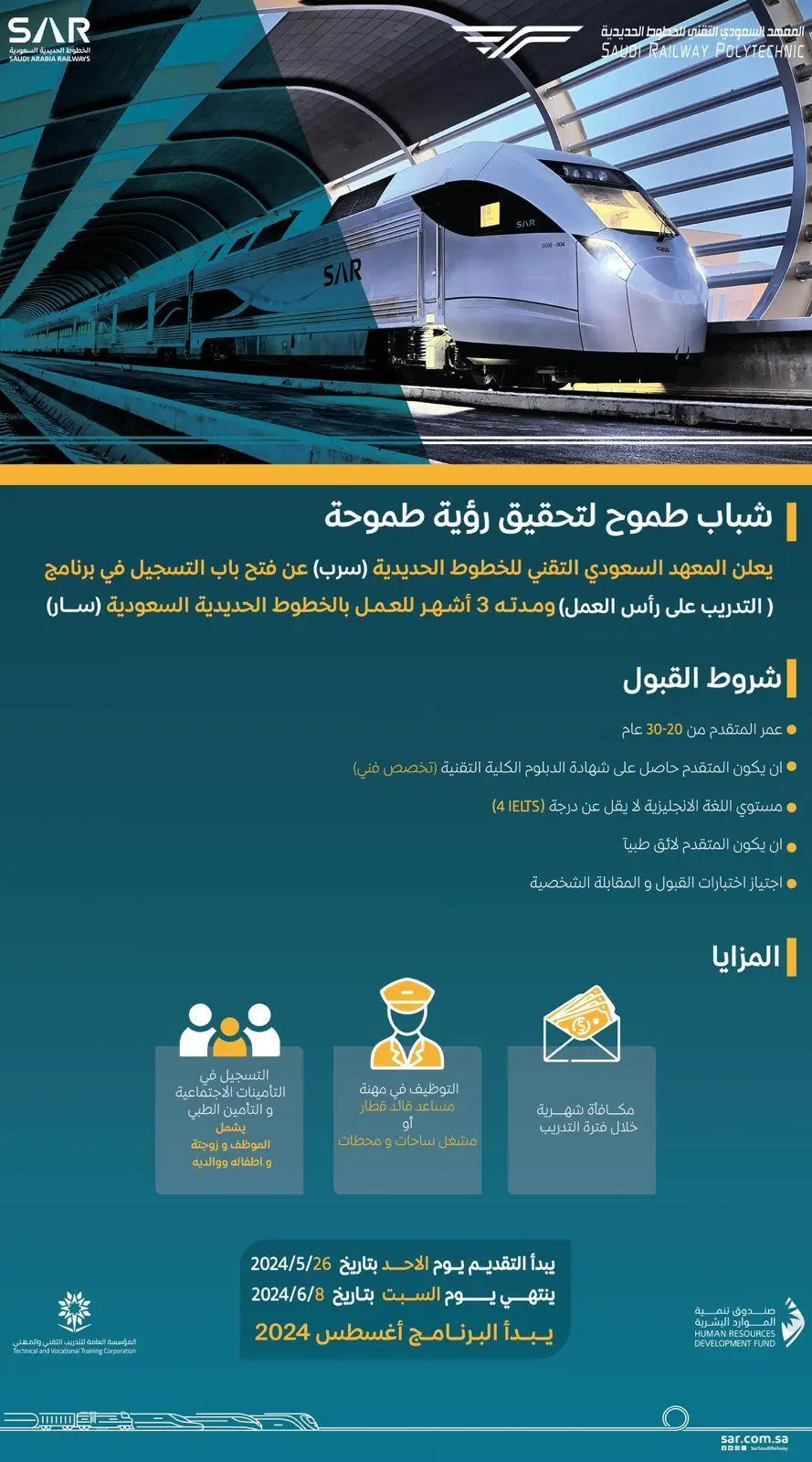 أعلن المعهد السعودي التقني للخطوط الحديدية (سرب) عن فتح باب التسجيل في برنامج التدريب على رأس العمل بالخطوط الحديدية السعودية “سار”، في مهنتي “مساعد قائد قطار” و”مشغل ساحات ومحطات”، حيث تمتد فترة التدريب 3 أشهر.