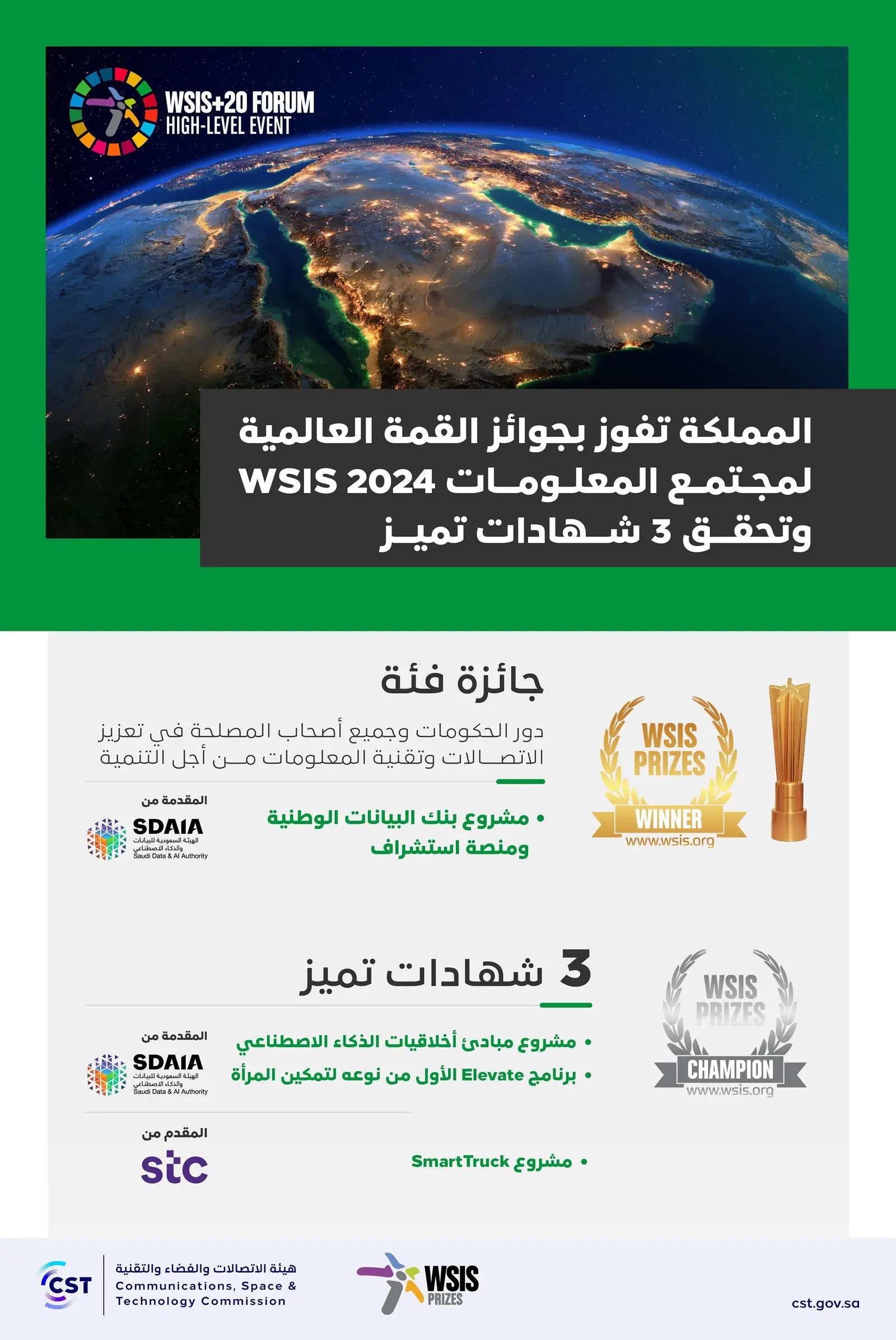 وحققت المملكة الفوز بالجائزة في فئة دور الحكومات وجميع أصحاب المصلحة في تعزيز الاتصالات وتقنية المعلومات، من أجل التنمية عن مشروع بنك البيانات الوطنية ومنصة استشراف، المقدم من الهيئة السعودية للبيانات والذكاء الاصطناعي (سدايا)، الذي يهدف إلى تحسين جودة البيانات في المملكة وتعزيز مشاركتها بين الجهات والإسهام في بناء اقتصاد رقمي قائم على البيانات عبر منصات مخصصة. كما حققت المملكة ثلاث شهادات تميز عن مشروع مبادئ أخلاقيات الذكاء الاصطناعي المقدم من (سدايا) والذي يهدف إلى تطوير الاعتبارات الأخلاقية وضمان تنفيذها طوال دورة حياة أنظمة الذكاء الاصطناعي، وبرنامج Elevate المقدم من (سدايا) الذي يعد الأول من نوعه لتمكين المرأة وتدريبها في مجالات البيانات والذكاء الاصطناعي، حيث تم تدريب أكثر من 1000 امرأة من 28 دولة منذ إطلاق البرنامج، بالإضافة إلى مشروع SmartTruck المقدم من شركة الاتصالات السعودية (STC) بالتعاون مع هواوي الذي يهدف إلى سد الفجوة الرقمية لدى كبار السن من خلال تقديم برامج تدريبية للمهارات الرقمية.