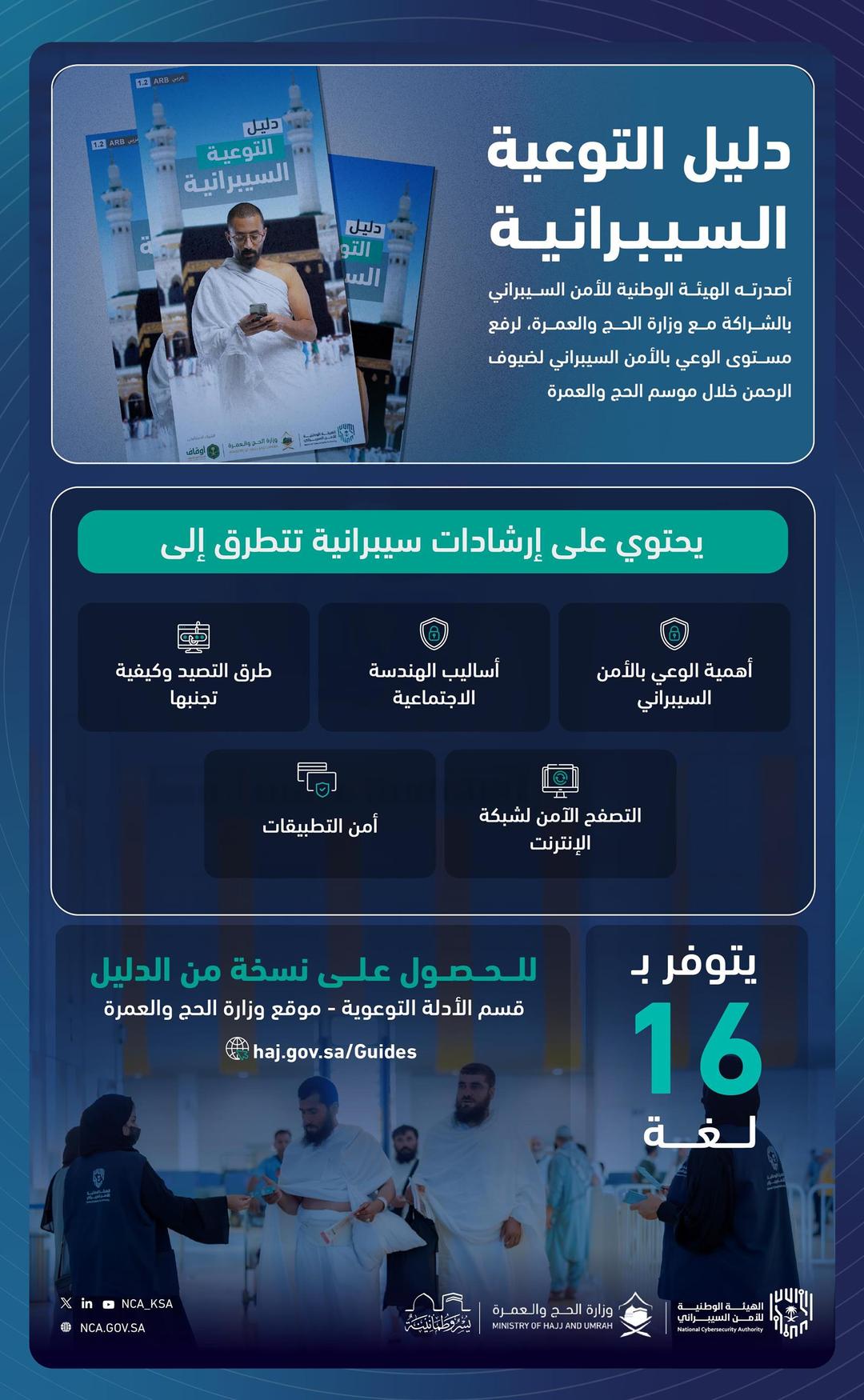 ويستعرض الدليل أهمية الوعي بالأمن السيبراني، ودوره في الحد من المخاطر السيبرانية خلال موسم الحج والعمرة، كما يتطرق إلى أساليب الهندسة الاجتماعية والتصيد وكيفية تجنبها، وأهمية التصفح الآمن لشبكة الإنترنت، وأمن التطبيقات، وإجراء النسخ الاحتياطي للهاتف الجوال بشكل دوري، وغيرها من الموضوعات التي من شأنها الإسهام في بناء ثقافة سيبرانية عالية لدى ضيوف الرحمن أثناء أداء مناسكهم من خلال 16 لغة يوفرها الدليل المتاح في قسم الأدلة التوعوية في موقع وزارة الحج والعمرة Haj.gov.sa/Guides .