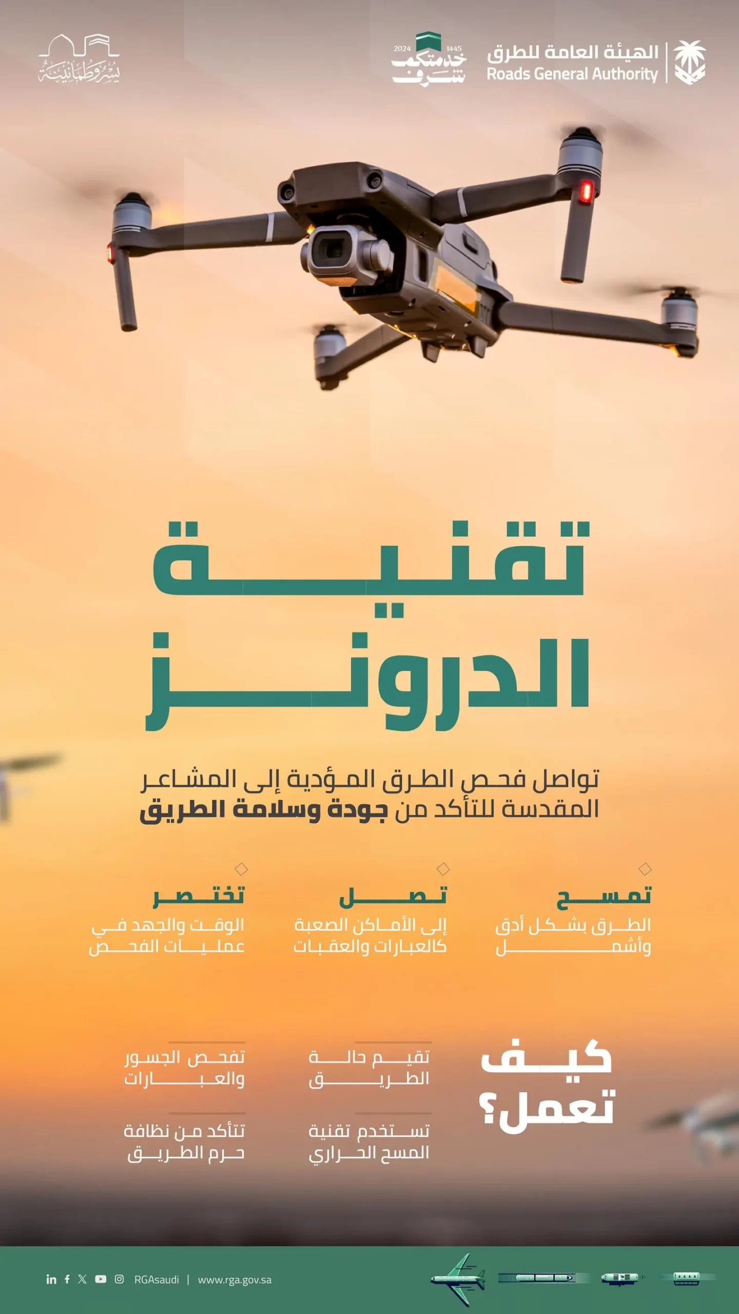 أعلنت الهيئة العامة للطرق عن مواصلة العمل على مسح وتقييم شبكة الطرق المؤدية للمشاعر المقدسة باستخدام أحدث التقنيات، ومنها تقنية الدرونز، التي تعمل على مسح شبكة الطرق بشكل أكثر دقة وشمولية، كما تتميز بإمكانية الوصول إلى الأماكن الصعبة كالعبارات والعقبات، بالإضافة إلى دورها في اختصار الوقت والجهد في عملية الفحص.