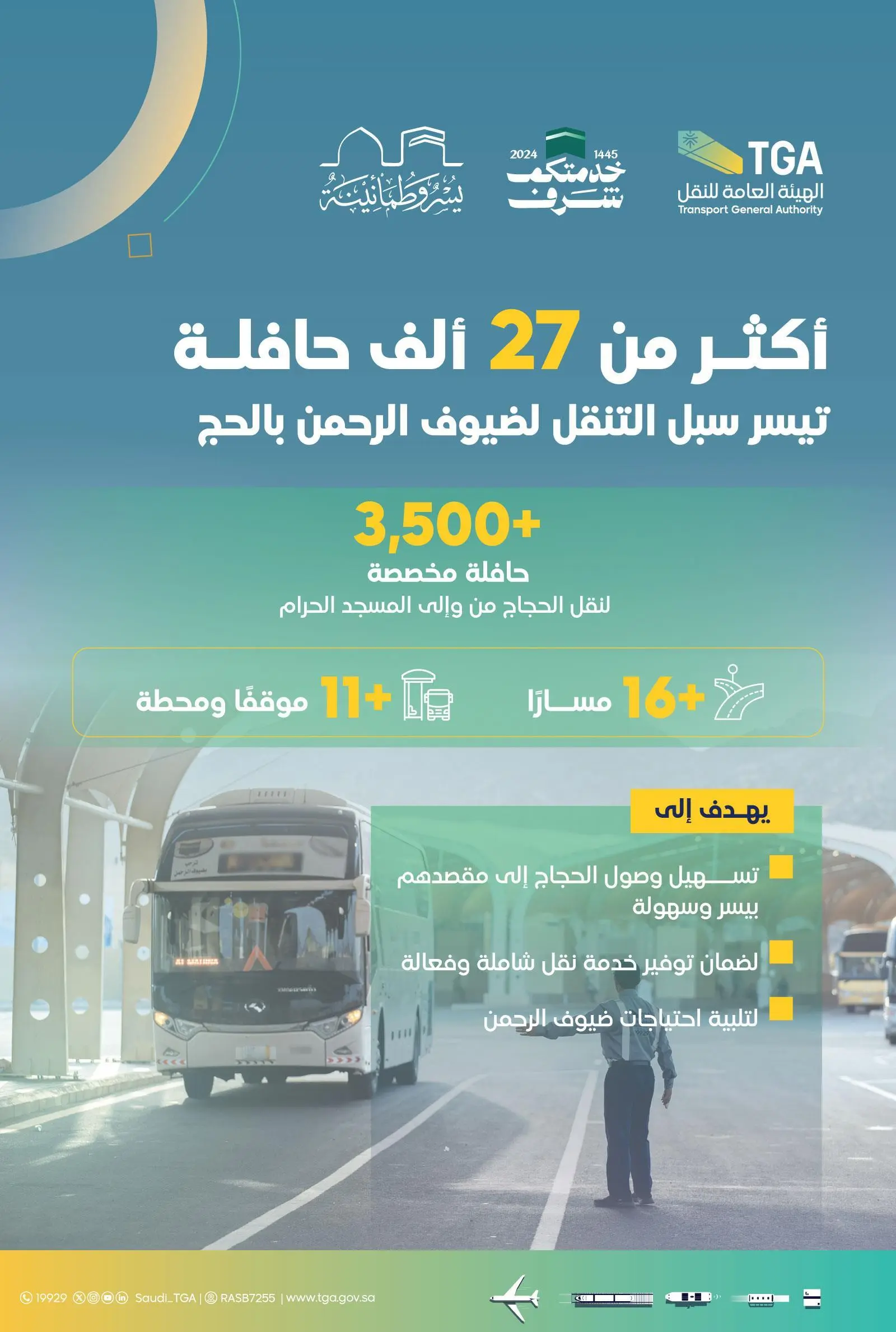 أكدت الهيئة العامة للنقل استعدادها لتيسير رحلة ضيوف الرحمن خلال موسم حج 1445هـ، عبر تهيئة أكثر من 27 ألف حافلة لخدمة حجاج بيت الله الحرام.