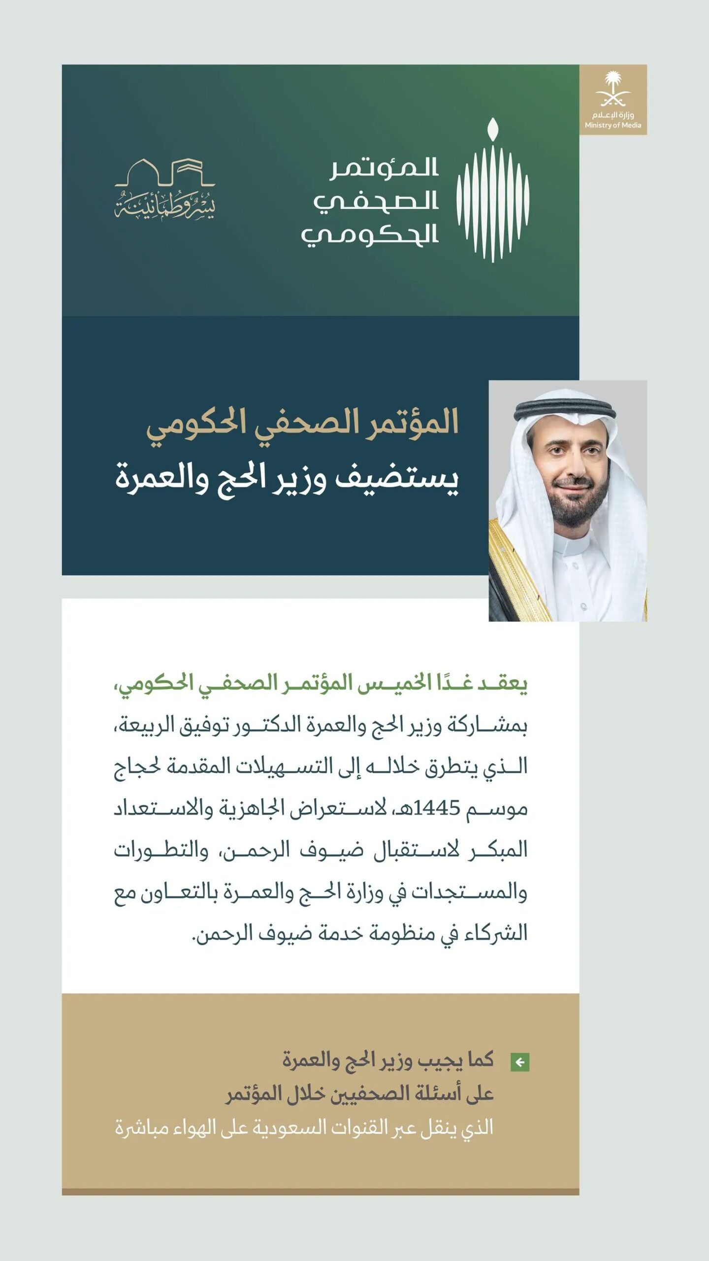 يُعقد غدًا الخميس , المؤتمر الصحفي الحكومي، بمشاركة معالي وزير الحج والعمرة الدكتور توفيق الربيعة، الذي يتطرق خلاله إلى التسهيلات المقدمة للحجاج لموسم حج هذا العام 1445هـ، واستعراض الجاهزية والاستعداد المبكر لاستقبال ضيوف الرحمن، والتطورات والمستجدات في وزارة الحج والعمرة بالتعاون مع الشركاء في منظومة خدمة ضيوف الرحمن.