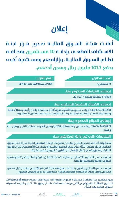 إدانة 10 مستثمرين بمخالفة نظام السوق المالية ولوائحه التنفيذية وإلزامهم ومستثمرة أخرى بدفع 101.7 مليون ريال وسجن أحدهم