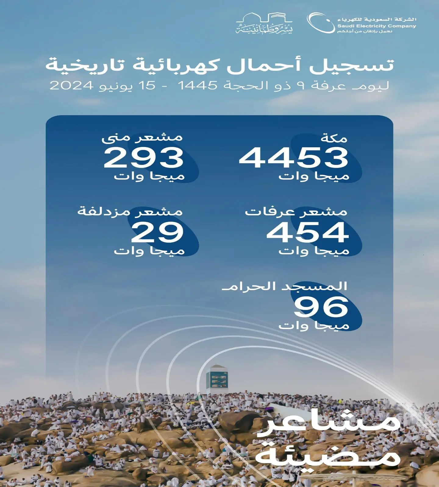 “السعودية للكهرباء”: أحمال تاريخية تشهدها عرفات بلغت 454 ميجا وات واستقرار للخدمة الكهربائية