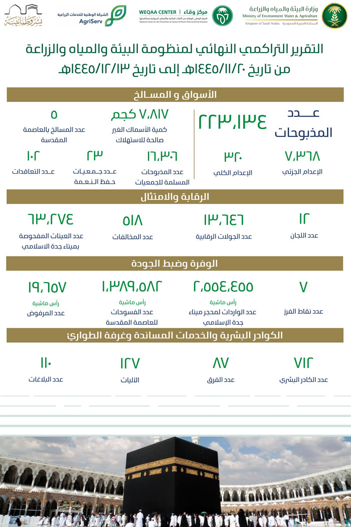 وقال إن منظومة الوزارة خلال موسم الحج لهذا العام فسحت حوالي 2.554.455 من الماشية الواردة للمملكة عن طريق ميناء جدة الإسلامي، وأوضح ان المختبرات فحصت أكثر من 63.274 ألف عينة في موسم الحج ، و تم فسح( 1.389.582) رأس ماشية في العاصمة المقدسة عبر 7 نقاط فرز . و أعلنت الوزارة ان مسالخها الخمسة بالعاصمة المقدسة استقبلت (223.134 ) ذبيحة .