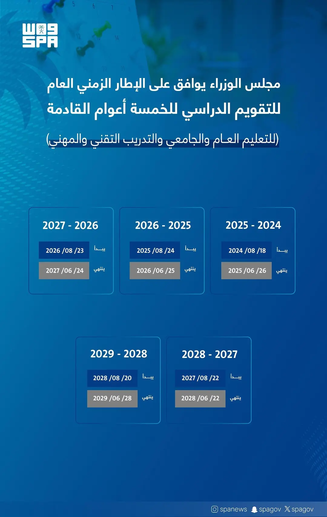 وافق مجلس الوزراء على الإطار الزمني العام للتقويم الدراسي في التعليم العام والجامعي، والتدريب التقني والمهني، وذلك للخمسة أعوام القادمة، بما يتضمنه من قواعد منظمة لذلك، وفترات زمنية تحدّد بداية العام الدراسي ونهايته.