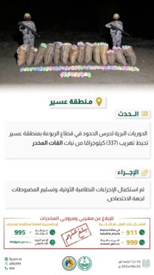 أحبطت الدوريات البرية لحرس الحدود في قطاع الربوعة بمنطقة عسير تهريب (337) كيلوجرامًا من نبات القات المخدر، وجرى استكمال الإجراءات النظامية الأولية، وتسليم المضبوطات لجهة الاختصاص.