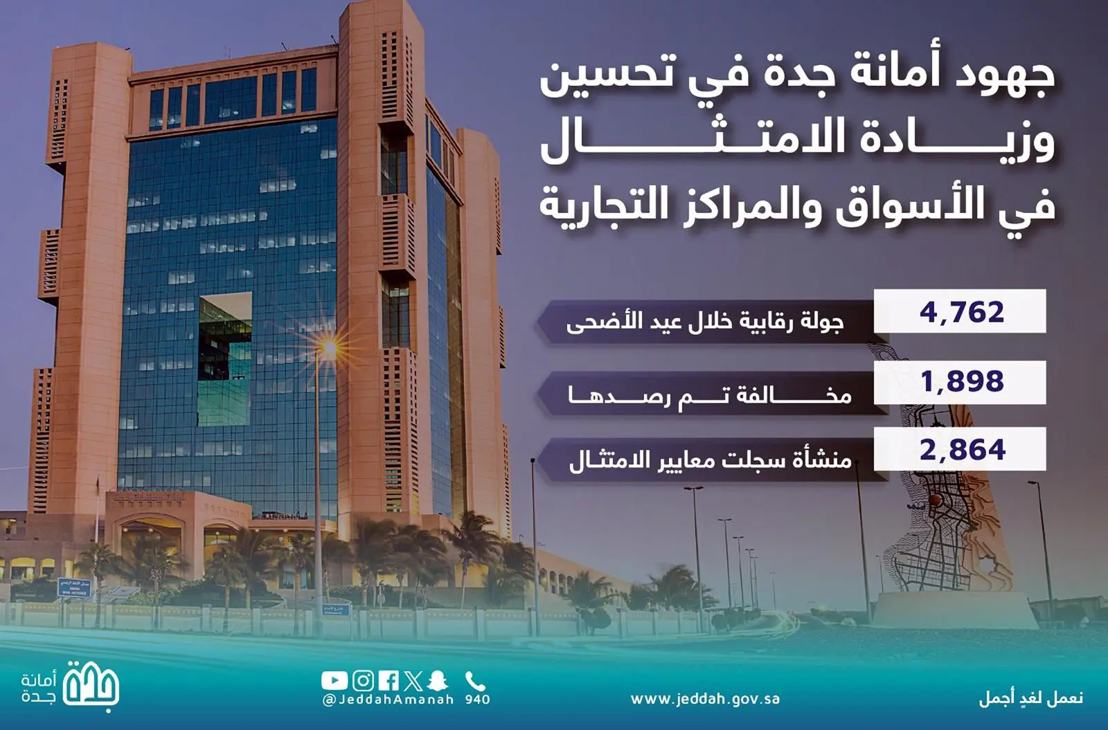 نفذت أمانة محافظة جدة 4.762 جولة رقابية خلال موسم الحج هذا العام، بنطاق 11 بلدية فرعية شملت محطات الوقود، صالونات الحلاقة، المخابز والحلويات، ومراكز التسوق، والمطابخ والمطاعم, ومحال بيع اللحوم، حيث جرى رصد 1.898 مخالفة.