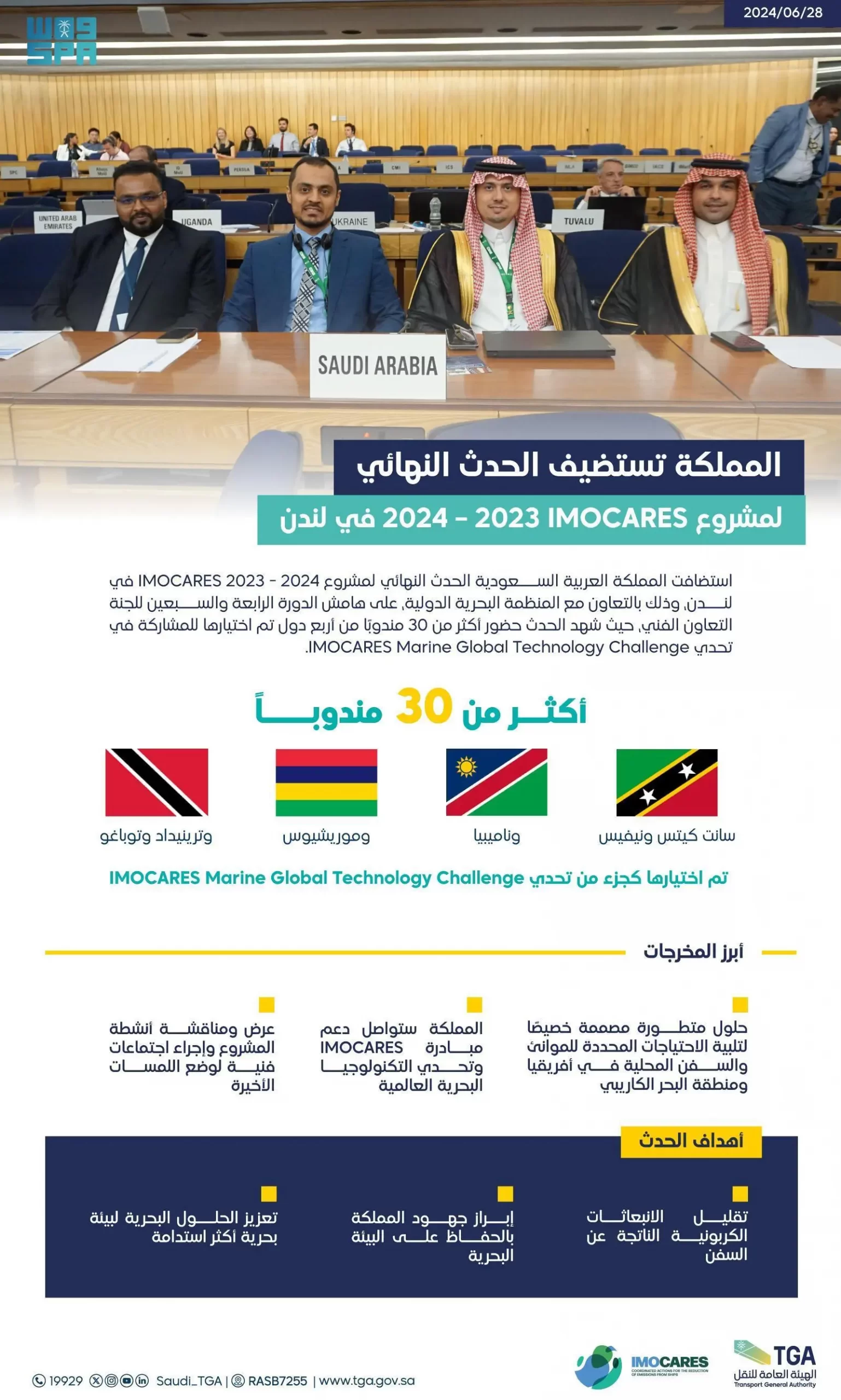 استضافت المملكة الحدث النهائي لمشروع IMOCARES 2023 – 2024 في لندن، وذلك بالتعاون مع المنظمة البحرية الدولية، على هامش الدورة الرابعة والسبعين للجنة التعاون الفني، بحضور أكثر من 30 مندوبًا من أربع دول تم اختيارها للمشاركة في تحدي IMOCARES Marine Global Technology Challenge.