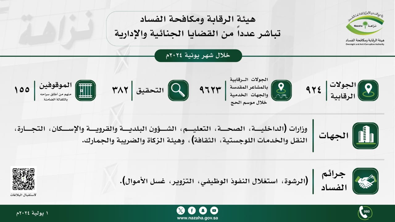 وكانت “نزاهة” قد باشرت 924 جولة رقابية خلال شهر يونيو الماضي، إضافةً إلى 9623 جولة رقابية بالمشاعر المقدسة والجهات الخدمية خلال موسم الحج.