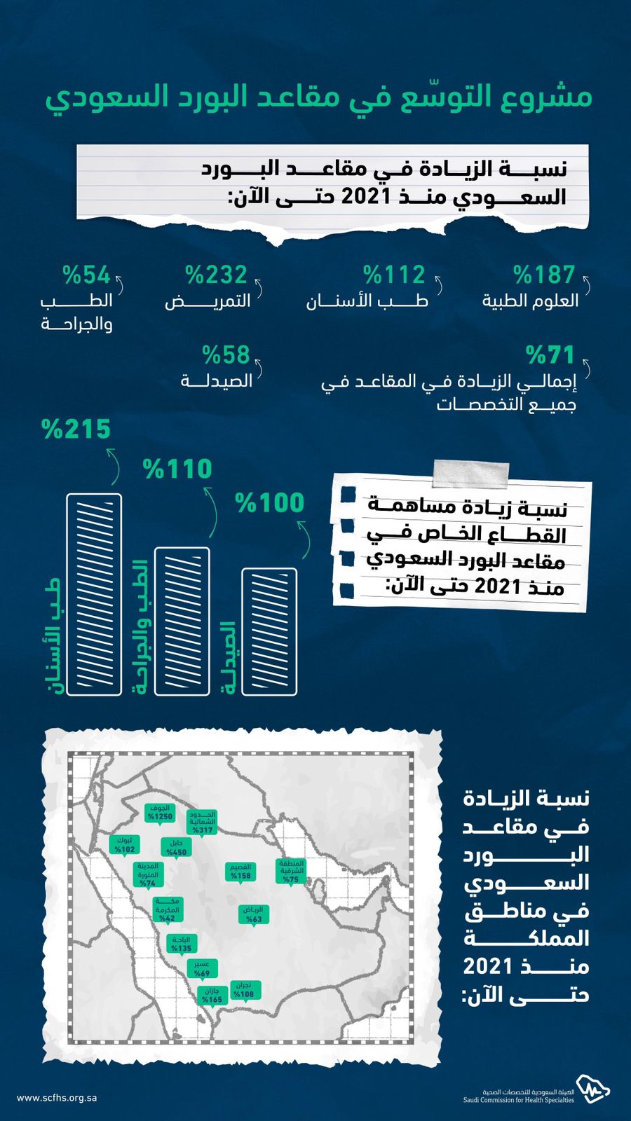 وشهد البورد السعودي نمواً ملحوظاً في مساهمة القطاع الخاص، حيث بلغت نسبة إسهام القطاع الخاص في مقاعد القبول منذ عام 2021 لتخصص الطب والجراحة 110 في المئة، تخصص طب الأسنان 215 في المئة، تخصص الصيدلة 100 في المئة، مما يعكس الشراكة المثمرة بين الهيئة والقطاع الخاص لتطوير الكوادر في القطاع الصحي.