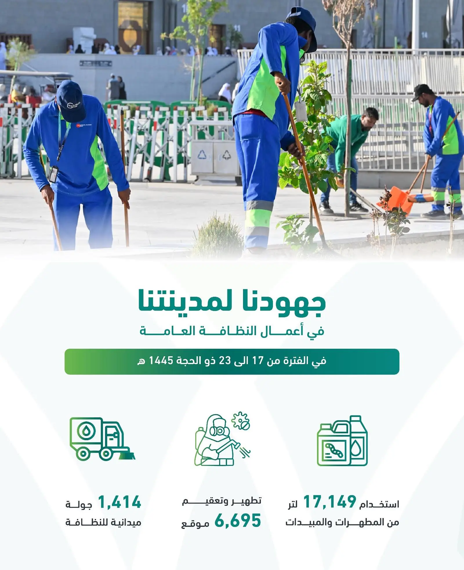 تواصل الفرق الميدانية التابعة لأمانة منطقة المدينة المنورة أعمالها البلدية على مدار الساعة، لخدمة الأهالي والزوار من ضيوف الرحمن.