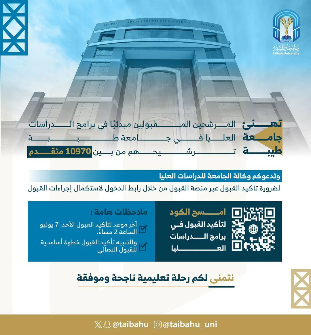 أعلنت جامعة طيبة اليوم، قائمة المرشحين الذي تم قبولهم مبدئياً في برامج الدراسات العليا بالجامعة للعام الجامعي المقبل.