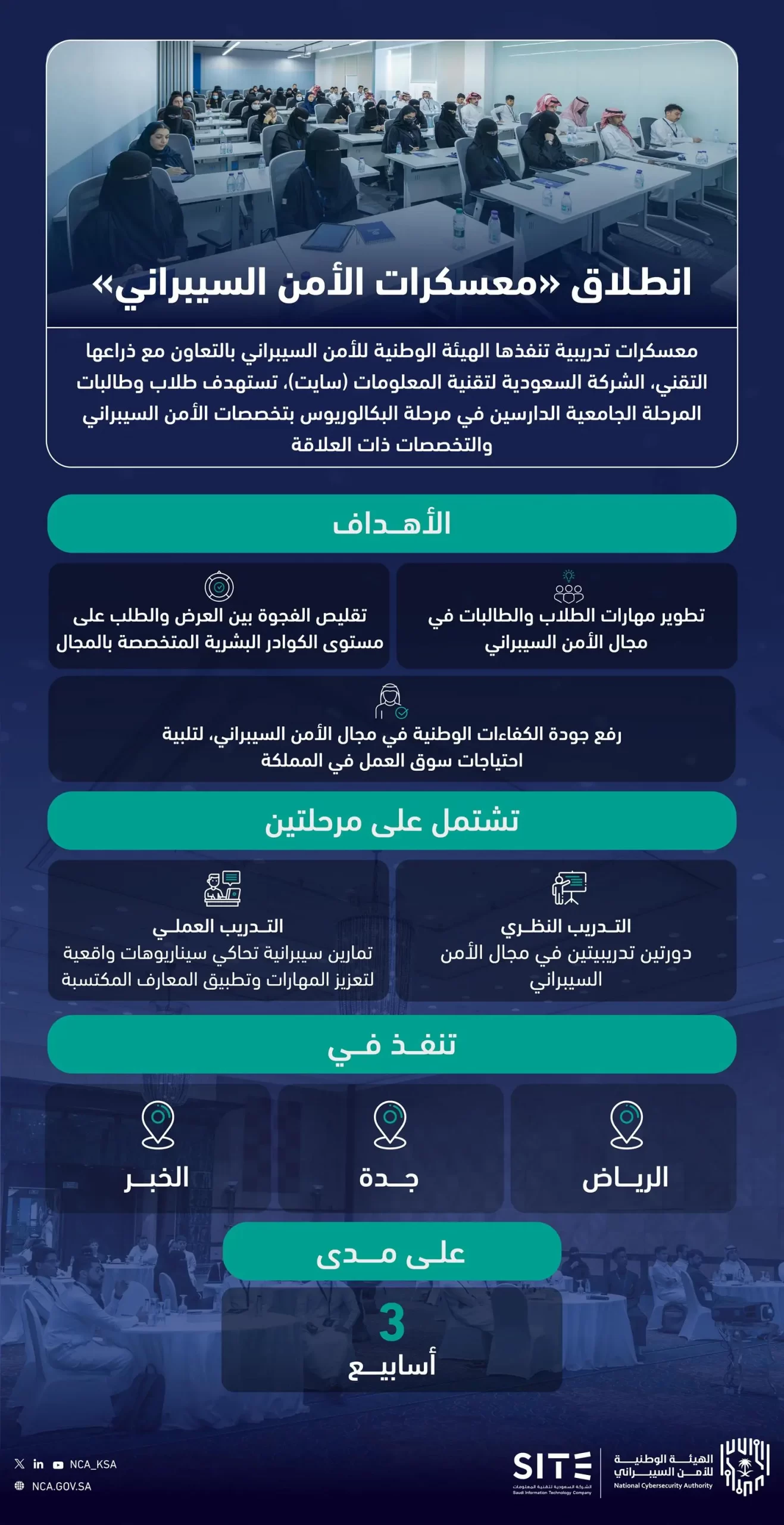وأوضحت الهيئة أن «معسكرات الأمن السيبراني» سيتم تنفيذها على مدى 3 أسابيع في الرياض وجدة والخبر بالتعاون مع الذراع التقني للهيئة الوطنية للأمن السيبراني، الشركة السعودية لتقنية المعلومات (سايت)، وعبر مرحلتين حيث تتمثل المرحلة الأولى في حضور التدريب النظري الذي يشتمل على دورتين تدريبيتين في مجال الأمن السيبراني، فيما تتضمن المرحلة الثانية تدريباً عملياً مكثفاً من خلال تنفيذ تمارين سيبرانية تحاكي سيناريوهات واقعية تهدف إلى تعزيز المهارات وتطبيق المفاهيم والمعارف التي تم اكتسابها خلال المرحلة الأولى.