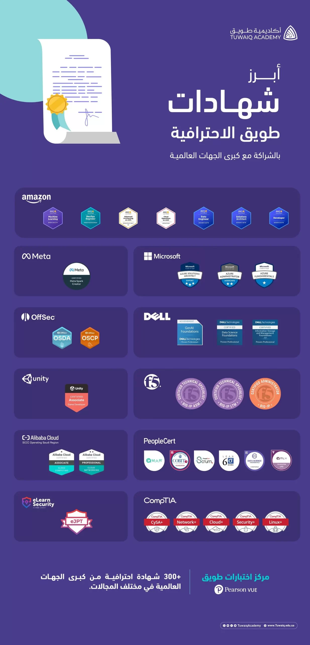 أعلنت أكاديمية طويق عن أبرز الشهادات الاحترافية التي تقدمها ضمن معسكراتها وبرامجها التعليمية، المقامة بالشراكة مع كبرى الجهات العالمية مثل: Apple, Meta, Microsoft, amazon, CompTIA, AliBaba وغيرها من الجهات التقنية، بالإضافة إلى إتاحة أكثر من 300 شهادة احترافية في مركز اختبارات طويق المعتمد عالميًا.