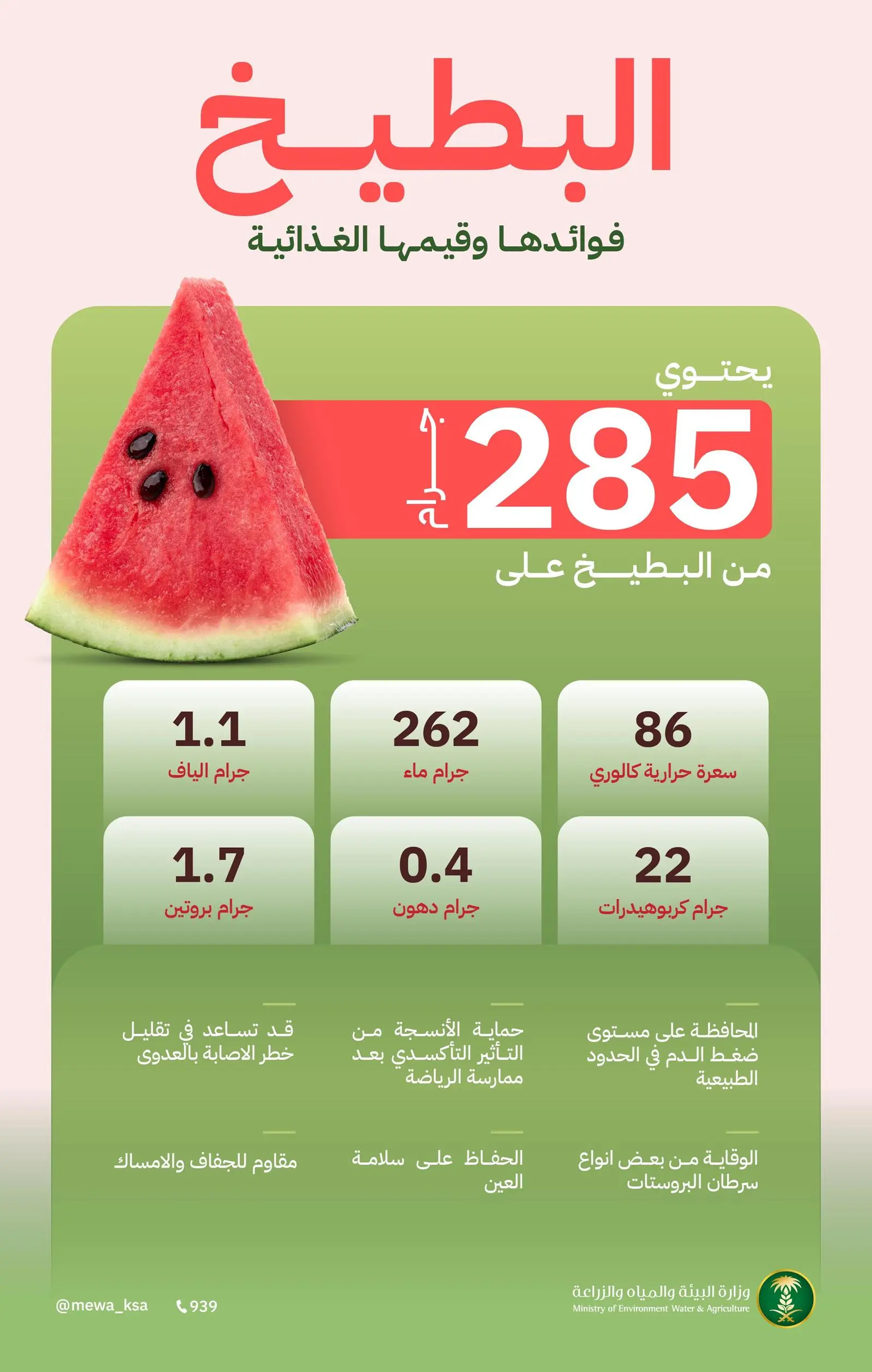 أكدت دراسة لوزارة البيئة والمياه والزراعة، أن (285) جرامًا من البطيخ يحتوي على (262) جرامًا من الماء، و(86) سعرة حرارية، و(22) جرامًا من الكربوهيدرات، و(1.7) جرامات من البروتين، و(1.1) جرام من الألياف، وحوالي (0.4) جرامات من الدهون، مشيرةً إلى أن البطيخ يعد من المنتجات الواعدة والرائدة في تعزيز الأمن الغذائي، وتعمل عدد من البرامج والخطط المحلية على رفع معدل إنتاجه خلال موسمه الذي ينطلق في فترة الصيف ويمتد إلى ستة أشهر.
