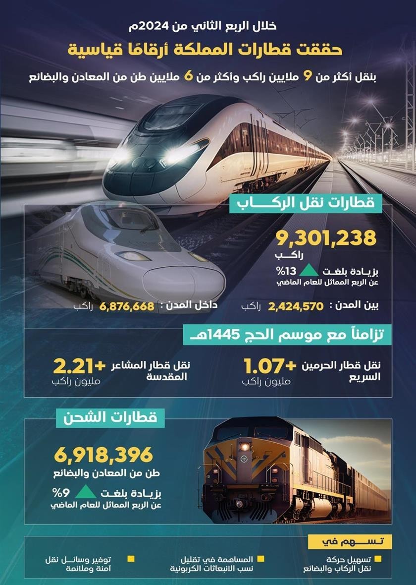 أعلنت الهيئة العامة للنقل عن تسجيل أرقام قياسية لقطارات المملكة تجاوزت أكثر من 9.3 ملايين راكب خلال الربع الثاني من العام الحالي 2024م، وبنسبة نمو بلغت 13% ونقلت، بين المدن 2,424,570 راكبًا, بينما داخل المدن 6,876,668 راكبًا، بزيادة بلغت عن الربع الثاني من العام الماضي 2023م.