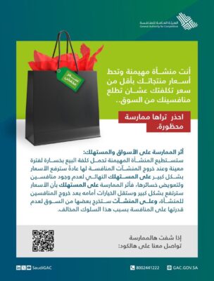 وأوضحت “المنافسة” أثر الممارسة على الأسواق والمستهلك ، لافتة إلى أنها ستستطيع المنشأة المهيمنة تحمل كلفة البيع بخسارة لفترة معينة وعند خروج المنشآت المنافسة لها عادة سترفع الأسعار بشكل كبير على المستهلك النهائي لعدم وجود منافسين ولتعويض خسائرها .