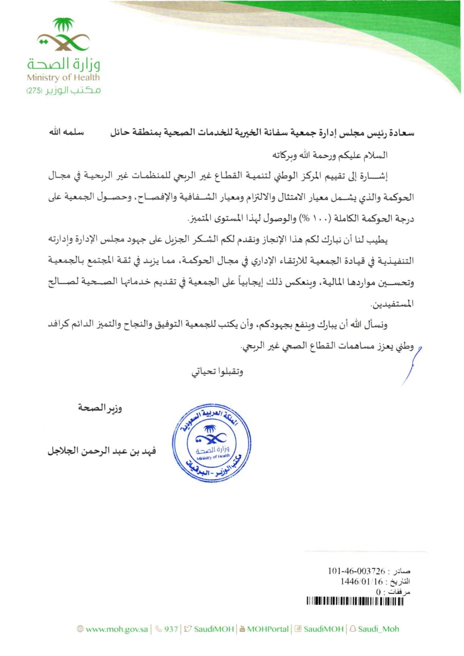 وجه معالي وزير الصحة فهد الجلاجل خطاب شكر لجمعية سفانة الصحية بمنطقة حائل وذلك بعد حصول الجمعية على درجة الحوكمة الكاملة ١٠٠٪ بناء على تقييم المركز الوطني لتنمية القطاع غير الربحي للمنظمات غير الربحية في مجال الحوكمة والذي يشمل معيار الامتثال والالتزام ومعيار الشفافية والإفصاح.