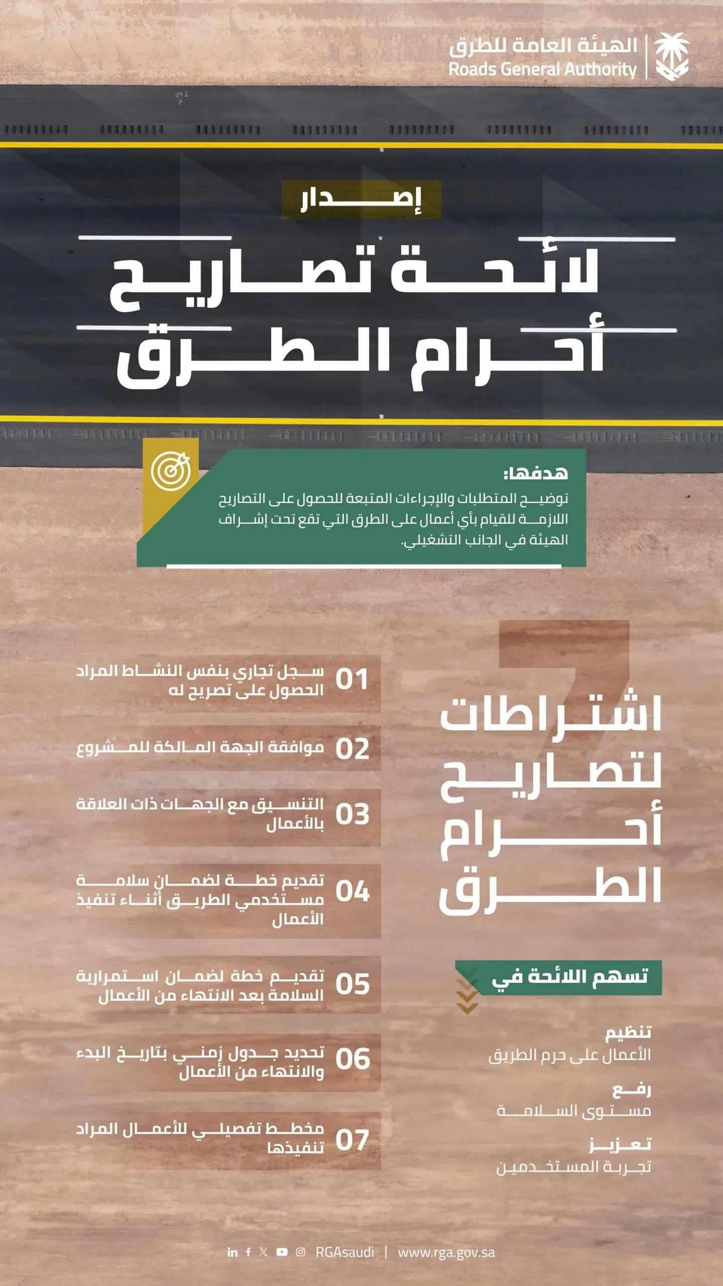 أصدرت الهيئة العامة للطرق لائحة تصاريح أحرام الطرق، التي تهدف إلى تنظيم الأعمال على حرم الطريق، ورفع مستوى السلامة، بالإضافة إلى تعزيز تجربة المستخدمين, وذلك انطلاقًا من دورها في تنظيم القطاع والإشراف عليه.