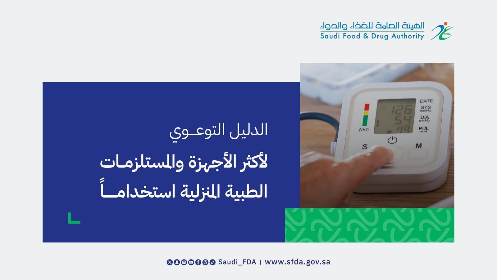 أصدرت الهيئة العامة للغذاء والدواء دليلًا توعويًا لأكثر الأجهزة والمستلزمات الطبية المنزلية استعمالًا، تضمن معلومات تفصيلية عن كيفية الاستخدام الآمن لها، وتنبيهات عامة للتعامل معها.
