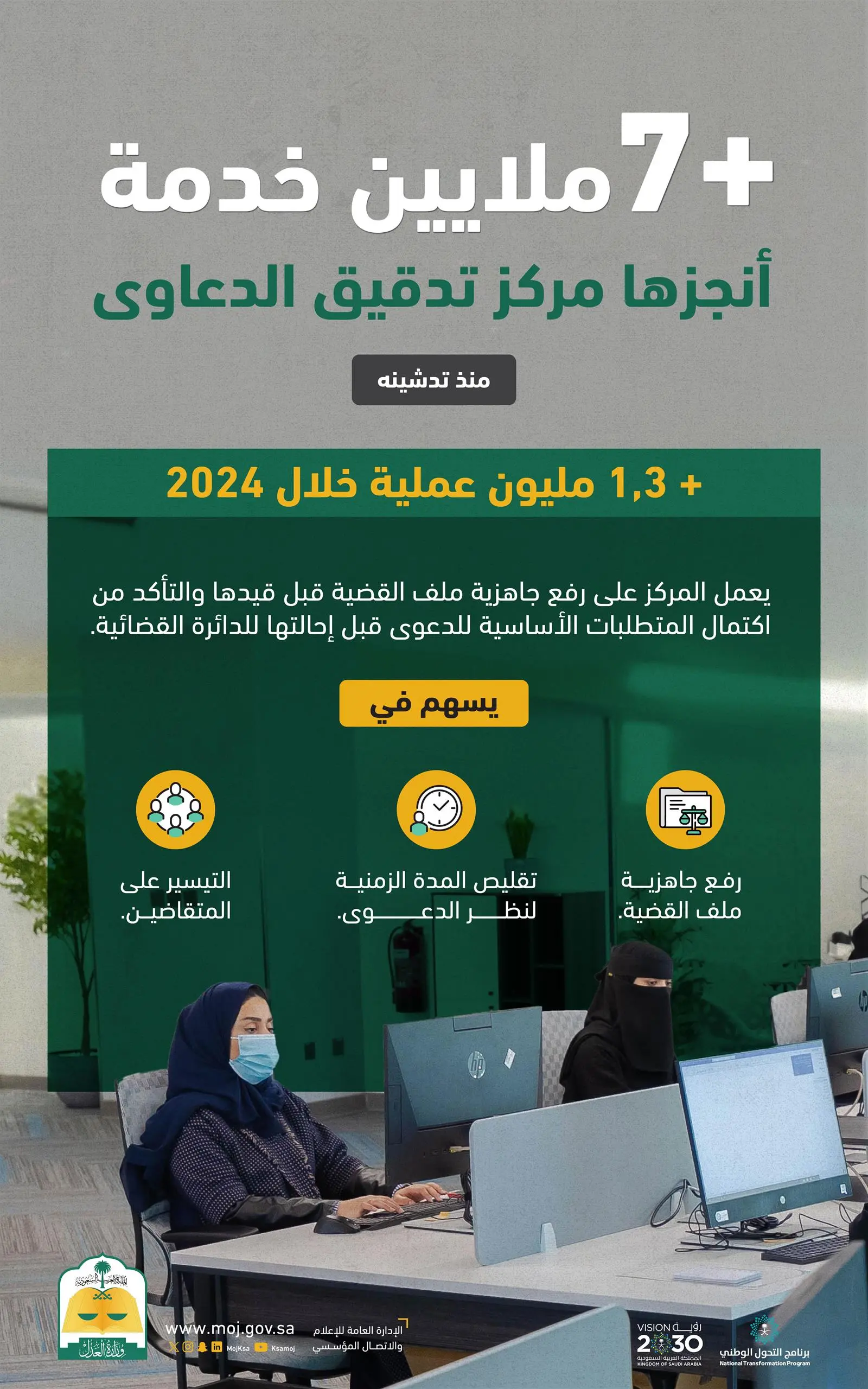 كشفت وزارة العدل عن إنجاز مركز تدقيق الدعاوى لأكثر من 7 ملايين خدمة تدقيق لصحائف الدعوى الواردة إلى جميع محاكم المملكة منذ تدشين المركز.