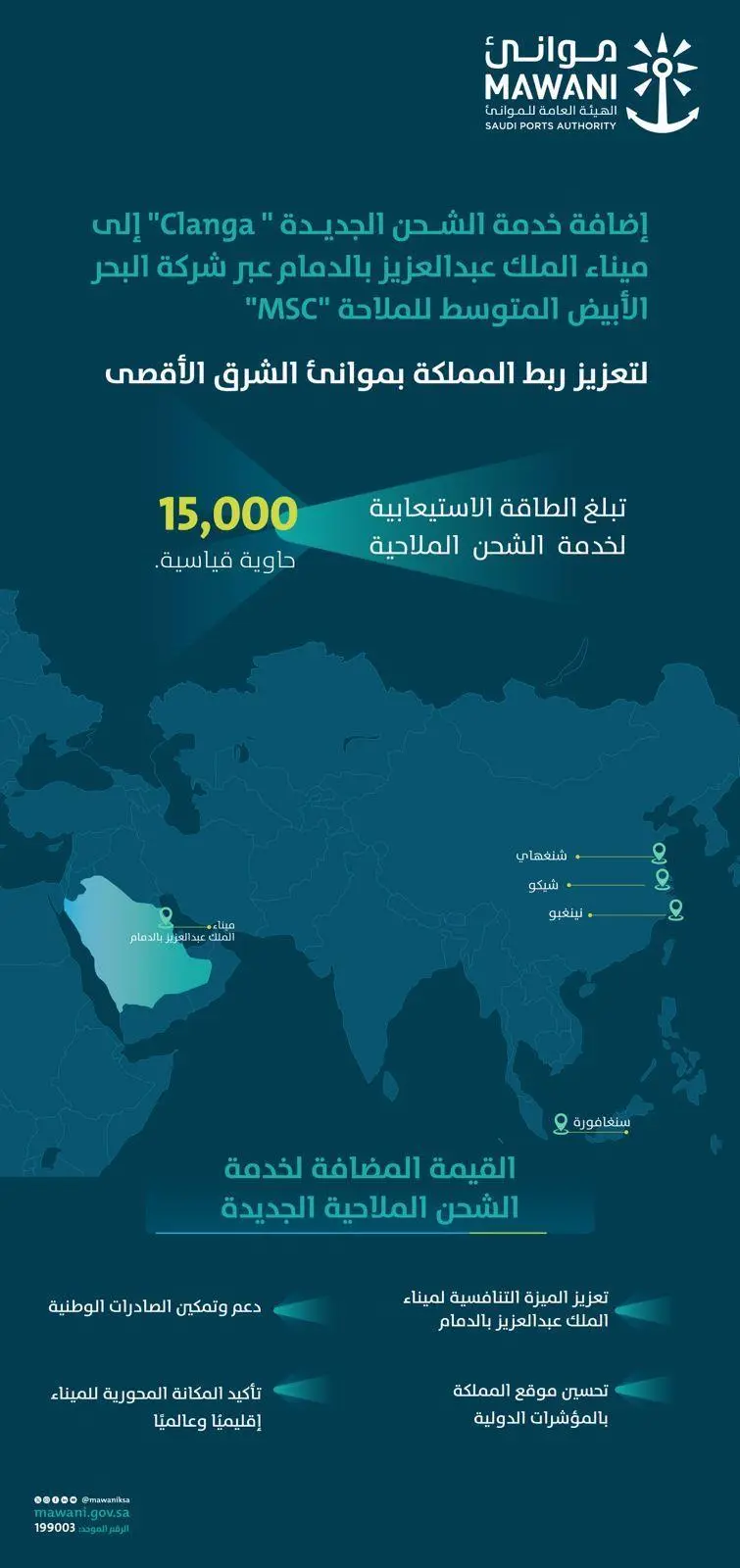 أعلنت الهيئة العامة للموانئ “موانئ” عن إضافة شركة البحر الأبيض المتوسط للملاحة “MSC” خدمة الشحن الملاحية الجديدة “Clanga” إلى ميناء الملك عبدالعزيز بالدمام، مما يعزز الاتصال التجاري بين المملكة وموانئ الشرق الأقصى.