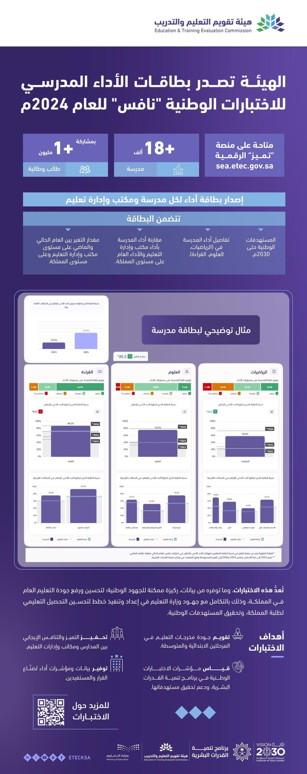 هيئة تقويم التعليم والتدريب تعلن إصدار بطاقات الأداء المدرسي الخاصة بالاختبارات الوطنية “نافس 2024” للمدارس الابتدائية والمتوسطة