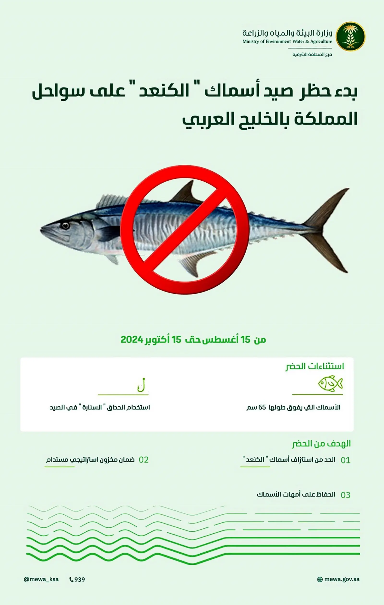 يبدأ يوم الخميس المقبل الموافق 2024/8/15م سريان حظر صيد أسماك الكنعد باستخدام شباك الصيد الخيشومية (المناصب، والغزول) في سواحل المنطقة الشرقية لمدة شهرين.