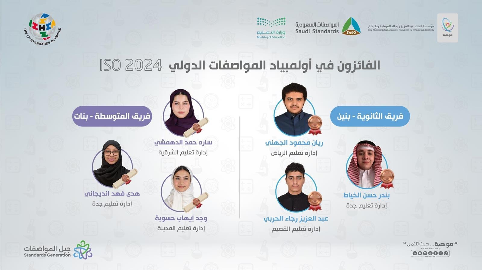 وحصلت مجموعة طلاب المرحلة الثانوية، المكونة من: ريان الجهني، من إدارة تعليم الرياض، وبندر الخياط من إدارة تعليم جدة، وعبدالعزيز الحربي من إدارة تعليم القصيم، على الميدالية البرونزية، فيما حازت مجموعة طالبات المرحلة المتوسطة، التي ضمت: سارة الدهمشي من إدارة تعليم الشرقية، ووجد حسوبة من إدارة تعليم المدينة، وهدى انديجاني من إدارة تعليم جدة، على جائزة شرف من معهد التقييم الكوري للتقنية الصناعية.