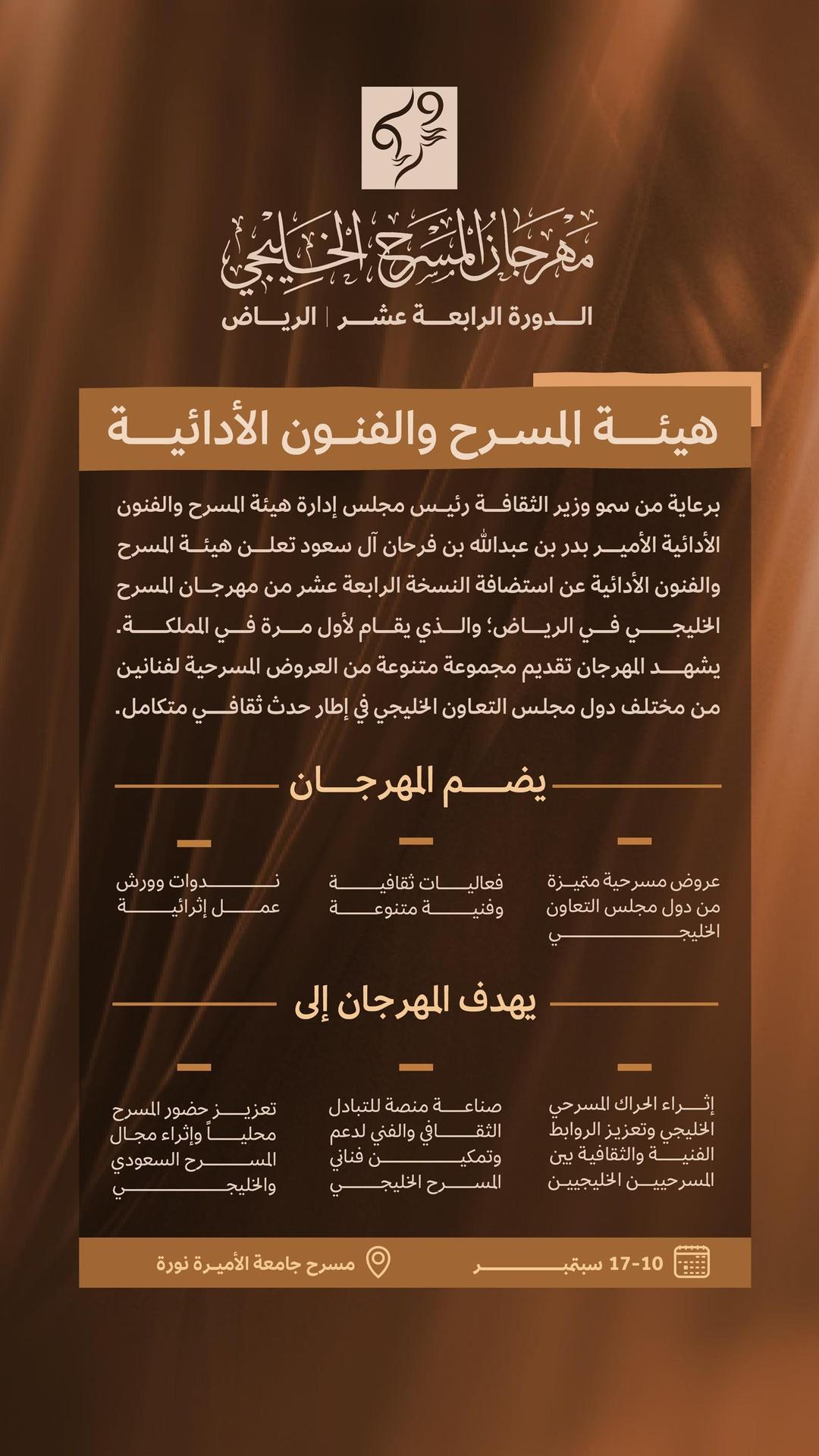 برعاية صاحب السمو الأمير بدر بن عبدالله بن فرحان وزير الثقافة رئيس مجلس إدارة هيئة المسرح والفنون الأدائية، أعلنت هيئة المسرح والفنون الأدائية عن استضافة مهرجان المسرح الخليجي في نسخته الرابعة عشرة في الرياض، على مدى ثمانية أيام من 10 حتى 17 سبتمبر المقبل، في تجمعٍ ثقافي مسرحي لفنانين ومبدعين من دول المجلس التعاون الخليجي تستضيفه المملكة للمرة الأولى.