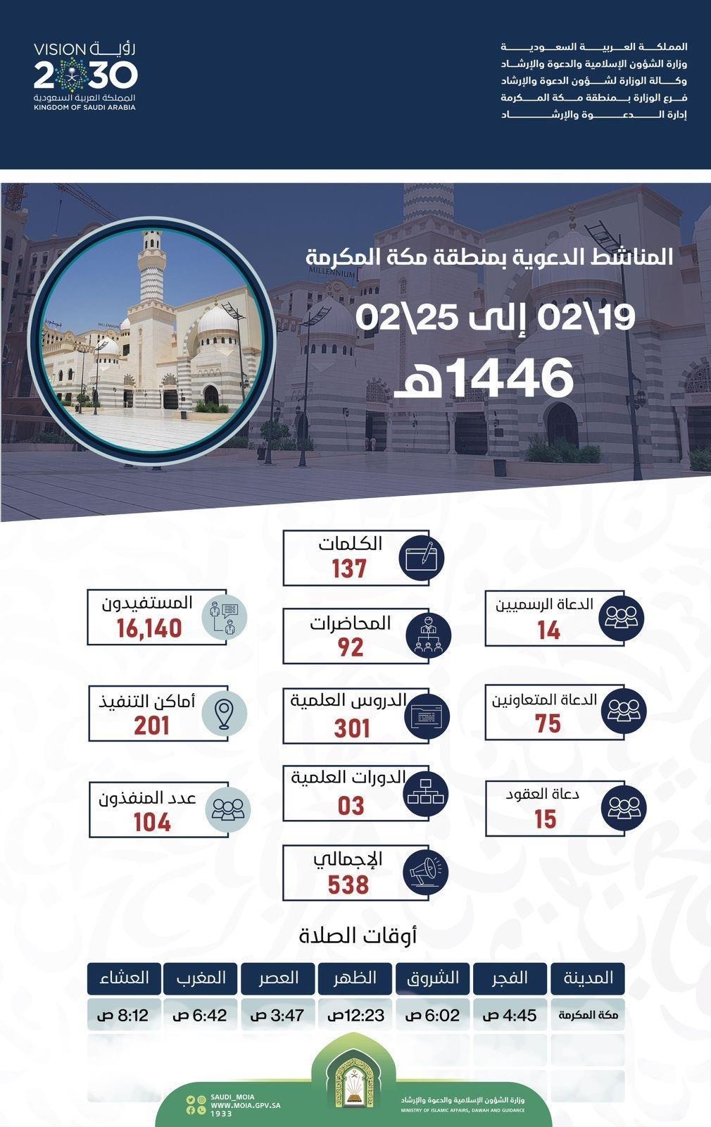 نفّذت وزارة الشؤون الإسلامية والدعوة والإرشاد، ممثلة بفرعها بمنطقة مكة المكرمة خلال الفترة من 19 إلى 25 من شهر صفر الجاري لعام 1446هـ، مناشط دعوية مختلفة تنوعت بين الكلمات والدروس والدورات والمحاضرات والندوات بإجمالي 538 منشطاً دعوياً، حيث تم تنفيذ 137 كلمة، و92 محاضرة، و301 درس، و3 دورات علمية وغيرها من المناشط التي استهدفت ما يقارب الـ 16,140 مستفيداً.