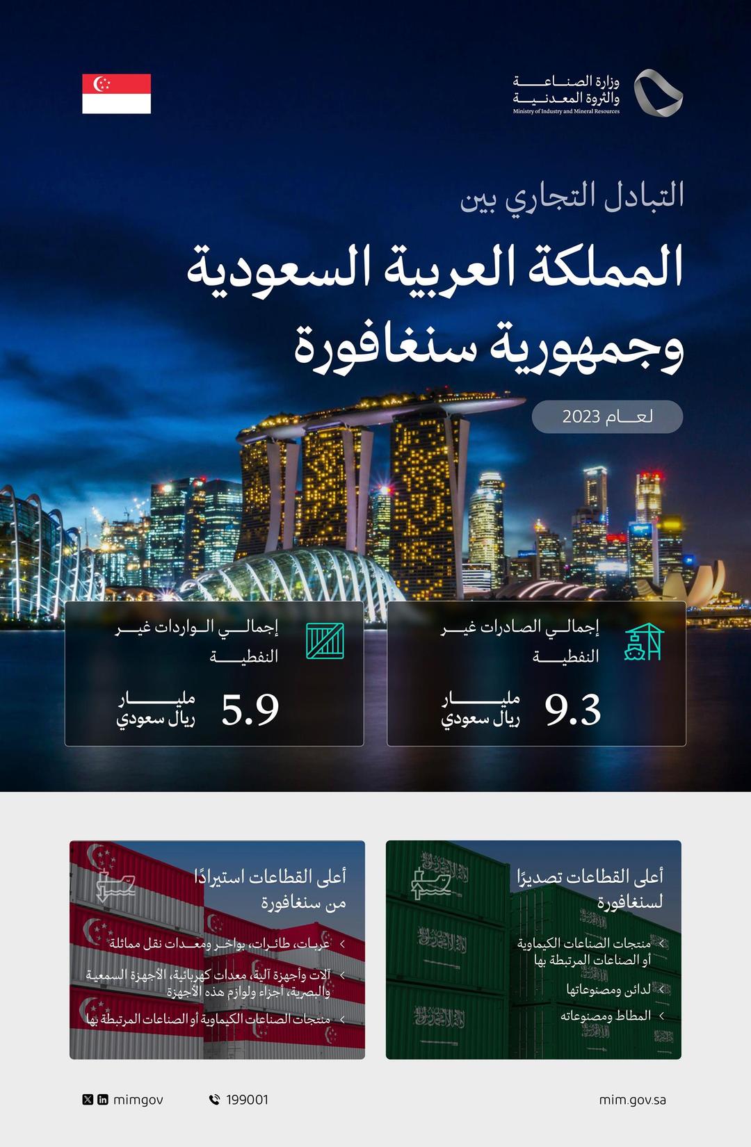 يذكر أن حجم الصادرات السعودية غير النفطية إلى سنغافورة خلال عام 2023م بلغ 9.3 مليارات ريال، فيما وصل حجم الواردات إلى 5.9 مليارات ريال في العام ذاته، وتنوعت أهم صادرات المملكة إلى سنغافورة بين اللدائن ومصنوعاتها، ومنتجات الصناعات الكيماوية، وأجهزة ومعدات كهربائية، ومعادن عادية ومصنوعاتها، بينما تمثلت أهم واردات المملكة من سنغافورة في سفن وقوارب ومنشآت عائمة، وأدوات وأجهزة للبصريات، وأجهزة للطب، ومنتجات صيدلانية.