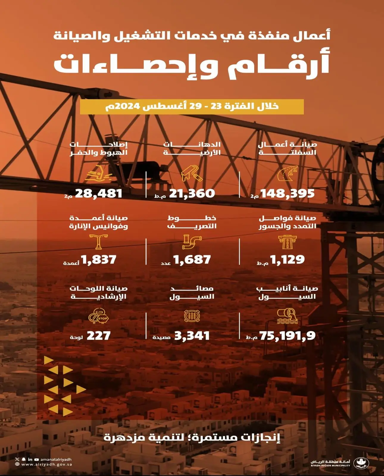 أنجزت أمانة منطقة الرياض في إطار رفع جودة خدمات التشغيل والصيانة، عددًا من أعمال الصيانة المجدولة، ومباشرة البلاغات الواردة من السكان، لصيانة أعمال السفلتة، الدهانات الأرضية، إصلاحات الهبوط والحفر، وغيرها من الخدمات البلدية في المدة من 23 إلى 29 أغسطس 2024م.