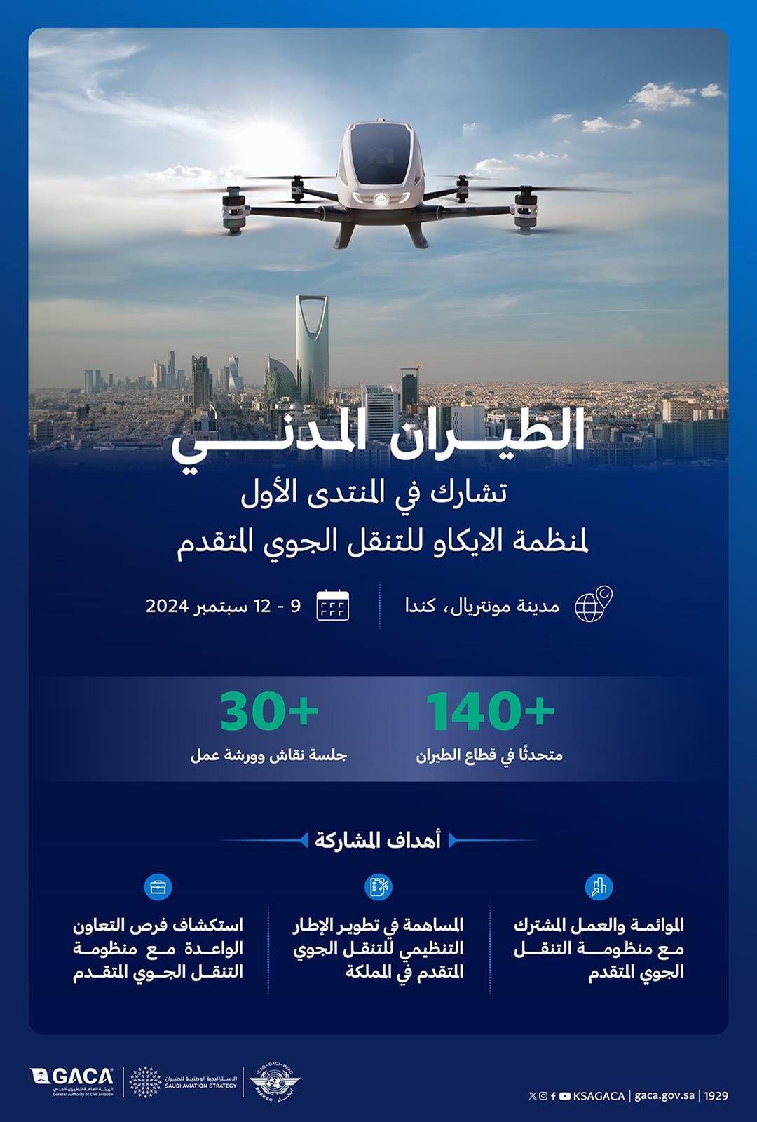 تشارك المملكة ممثلة بالهيئة العامة للطيران المدني بوفد برئاسة معالي رئيس الهيئة العامة للطيران المدني الأستاذ عبدالعزيز بن عبدالله الدعيلج غداً، في المنتدى الأول لمنظمة الطيران المدني الدولي (ICAO) حول التنقل الجوي المتقدم (AAM)، الذي يقام في مدينة مونتريال بكندا، خلال الفترة من 9 إلى 12 سبتمبر 2024، بمشاركة دول الأعضاء في منظمة الإيكاو وقادة قطاع الطيران في العالم.