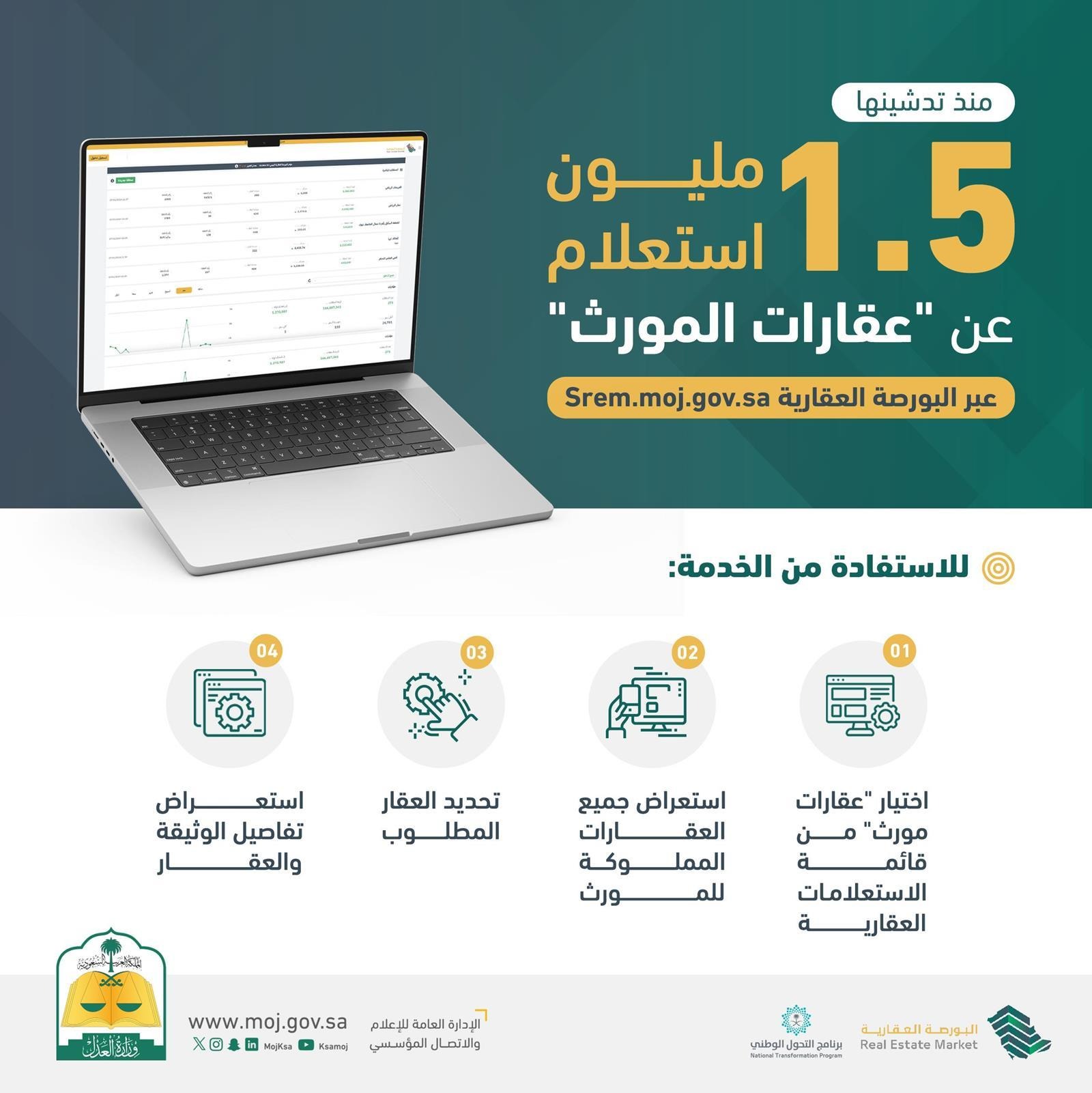 كشفت وزارة العدل، عن عدد الاستعلامات عبر خدمة “الاستعلام عن عقارات مورث” على البورصة العقارية، والذي بلغ أكثر من 1.5 مليون استعلام، منذ تدشينها.