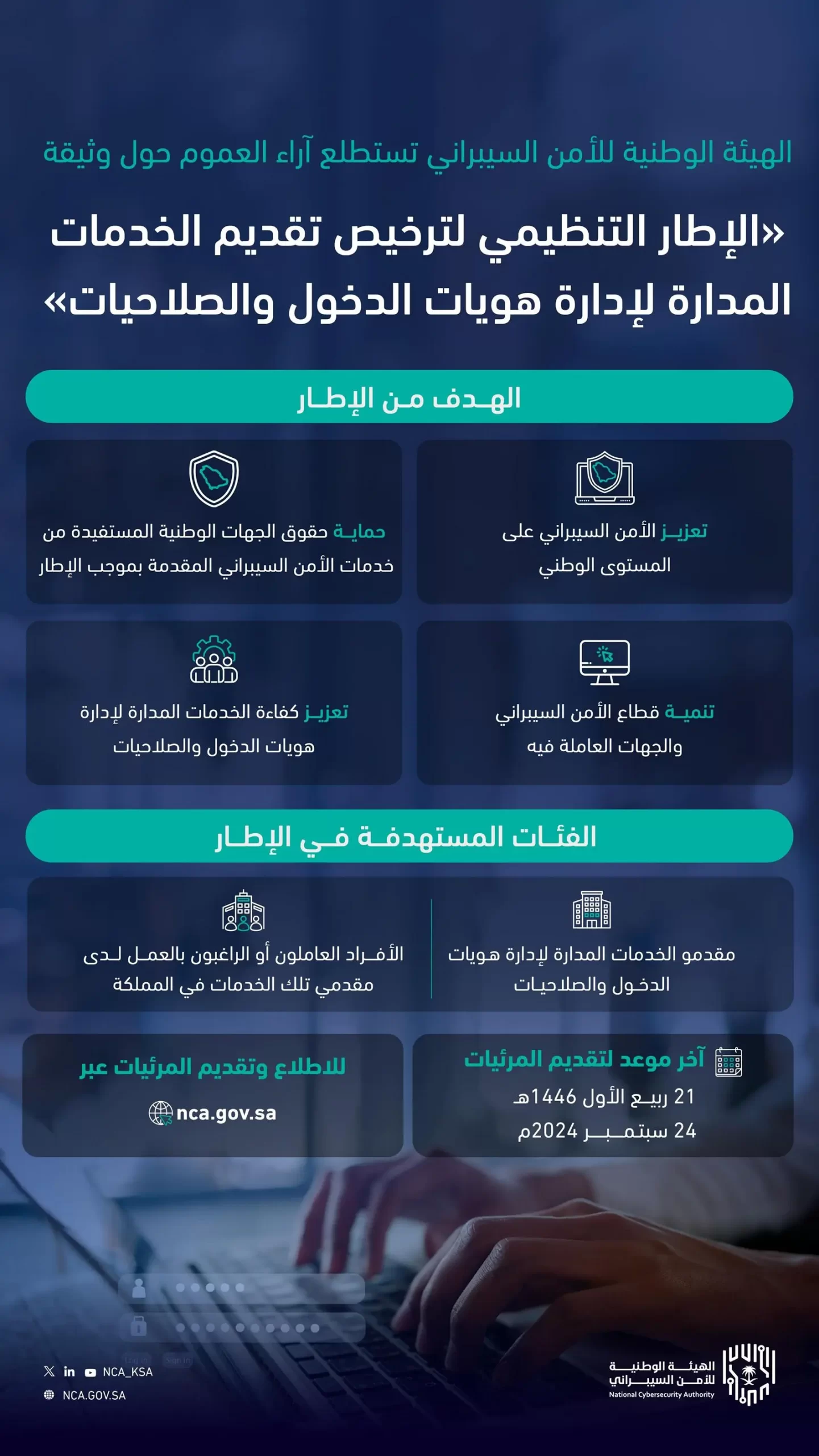 الهيئة الوطنية للأمن السيبراني تستطلع آراء العموم حول وثيقة “الإطار التنظيمي لترخيص تقديم الخدمات المدارة لإدارة هويات الدخول والصلاحيات”