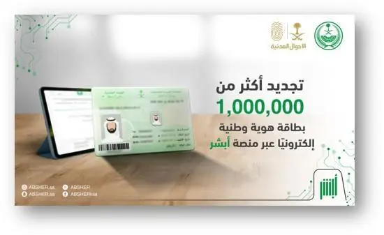 واستفاد المواطنون والمواطنات من خدمة تجديد بطاقة الهوية الوطنية ورفع الصورة الشخصية إلكترونياً عبر منصة ابشر، قبل انتهاء صلاحيتها بـ (180) يومًا دون الحاجة إلى زيارة مكاتب الأحوال المدنية.