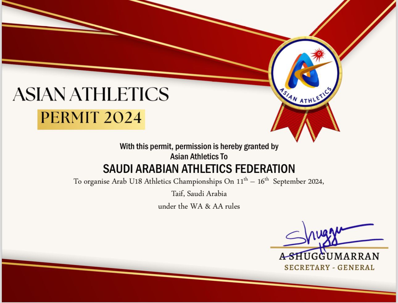 تزامناً مع البطولة العربية العاشرة للناشئين والناشئات ٢٠٢٤ والمقامة على ملعب مدينة الملك فهد الرياضية بالطائف اعتمدا الاتحاد الاسيوي والدولي ترخيص البطولة وفقا للأنظمة الدولية.