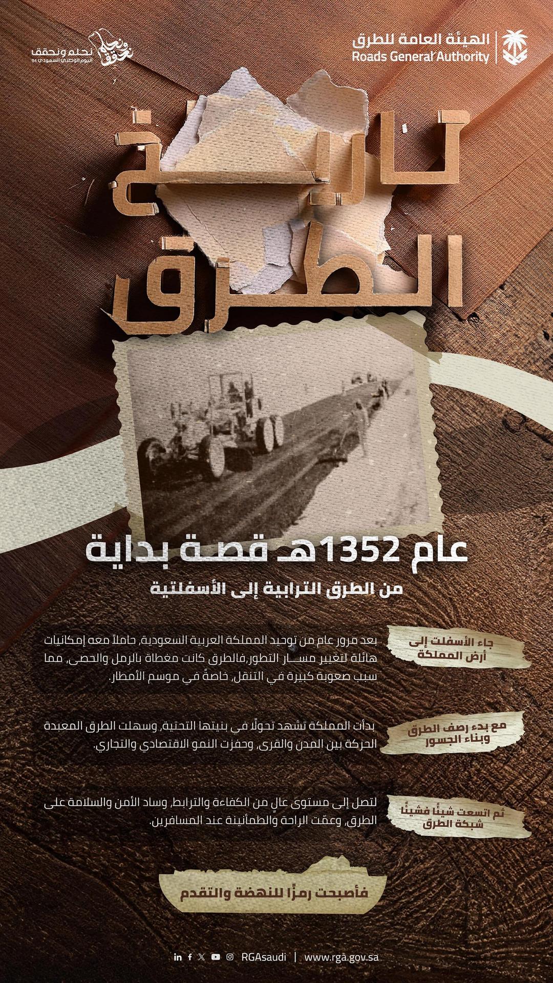 أعلنت الهيئة العامة للطرق أن الطرق الإسفلتية دخلت المملكة العربية السعودية عام 1352 هـ، وذلك بعد عام من توحيد المملكة، وهو الأمر الذي يؤكد حجم اهتمام قيادة هذا البلد المبارك من عهد المؤسس الملك عبدالعزيز بن عبدالرحمن – طيب الله ثراه – وأبنائه الأوفياء، حيث أسهمت شبكة الطرق في دعم التنمية والنهضة الشاملة وتعزيز ربط كافة مدن ومحافظات المملكة العربية السعودية.