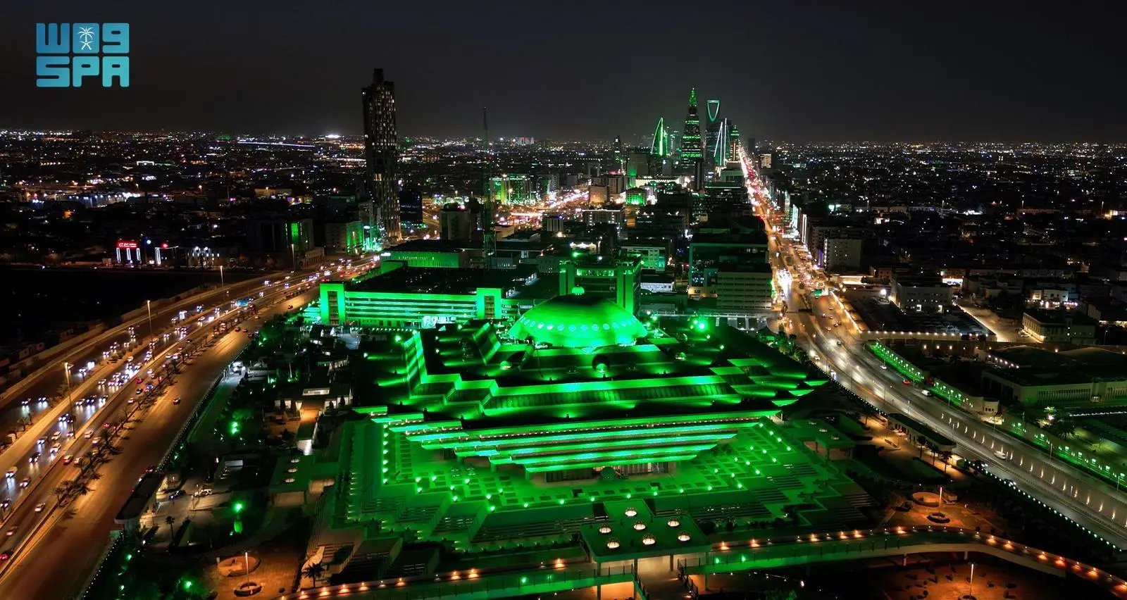 اكتسى مبنى وزارة الداخلية بمدينة الرياض , اللون الأخضر ابتهاجًا بمناسبة ذكرى اليوم الوطني الـ (94) للمملكة، الذي يعد من أبرز معالم العاصمة لما يتميز به من تصميم هندسي جذاب ومميز.