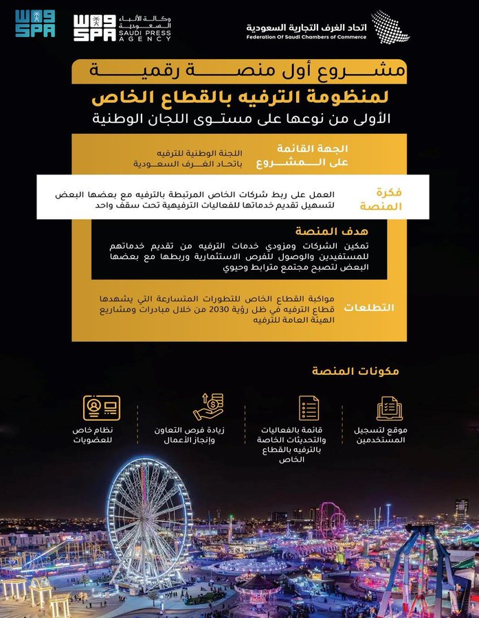 أعلن اتحاد الغرف السعودية ممثلًا باللجنة الوطنية للترفيه عن البدء في تنفيذ مشروع لبناء منصة رقمية هي الأولى من نوعها لمنظومة الترفيه تعمل على ربط شركات الخاص مع بعضها البعض لتسهيل تقديم خدماتها للفعاليات الترفيهية تحت سقف واحد وتمكينها من الوصول للفرص الاستثمارية وربطها مع بعضها البعض لتصبح مجتمع مترابط وحيوي.