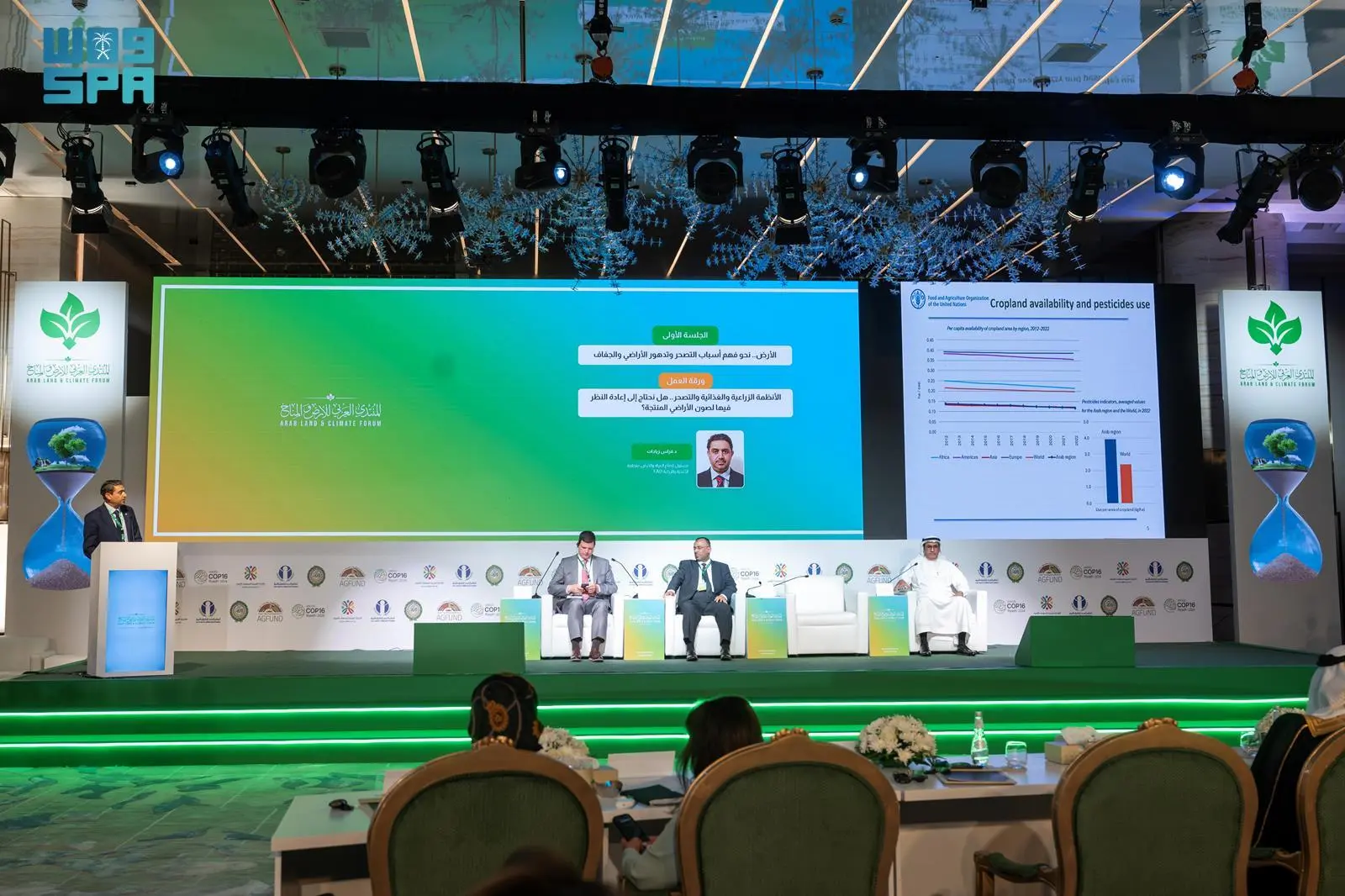 وفي الجلسة الأولى التي تأتي تحت عنوان: “الأرض.. نحو فهم أسباب التصحر والجفاف”، شارك مراسل العلوم والتكنولوجيا لاتفاقية الأمم المتحدة لمكافحة التصحر ومستشار الفاو الدكتور طلال درويش، ومسؤول قطاع المياه والأرض، منظمة الأغذية والزراعة “الفاو” الدكتور فراس زيادات، واستشاري التغيرات المناخية بالأمم المتحدة وعضو الهيئة الدولية لتغير المناخ الدكتور سمير طنطاوي، وناقشوا العوامل الاجتماعية والاقتصادية المسببة للتصحر وتدهور الأراضي والجفاف، الأنظمة الزراعية والتصحر، فضلًا عن التصحر وتدهور الأراضي والجفاف في ظل تغير المناخ في المنطقة العربية