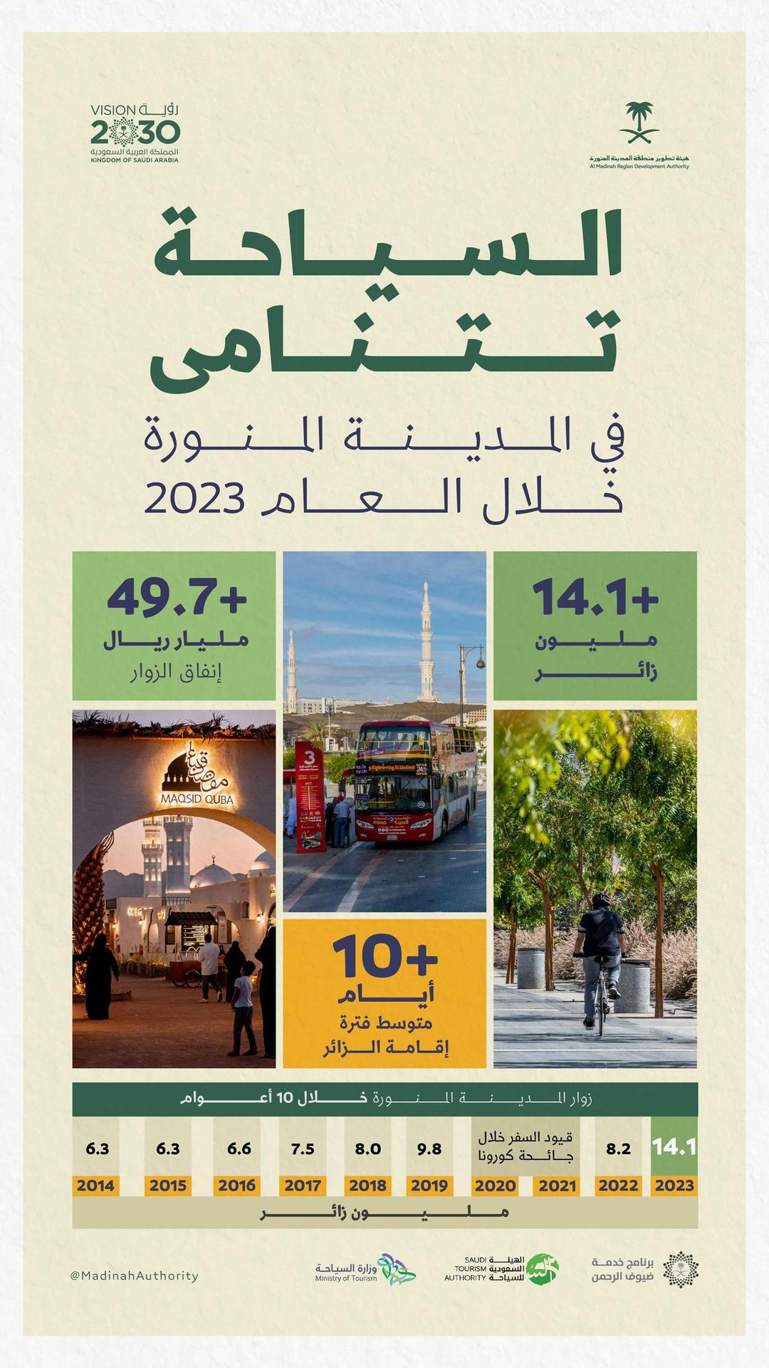 حقق القطاع السياحي في المدينة المنورة نموًّا خلال العام الماضي 2023م باستقبال 14.1 مليون زائر، مما يجسّد نجاح البرامج والمبادرات التي تستهدف تنشيط القطاع السياحي، وتعكس جودة الخدمات المقدمة للعناية بالزوار على مدار العام.